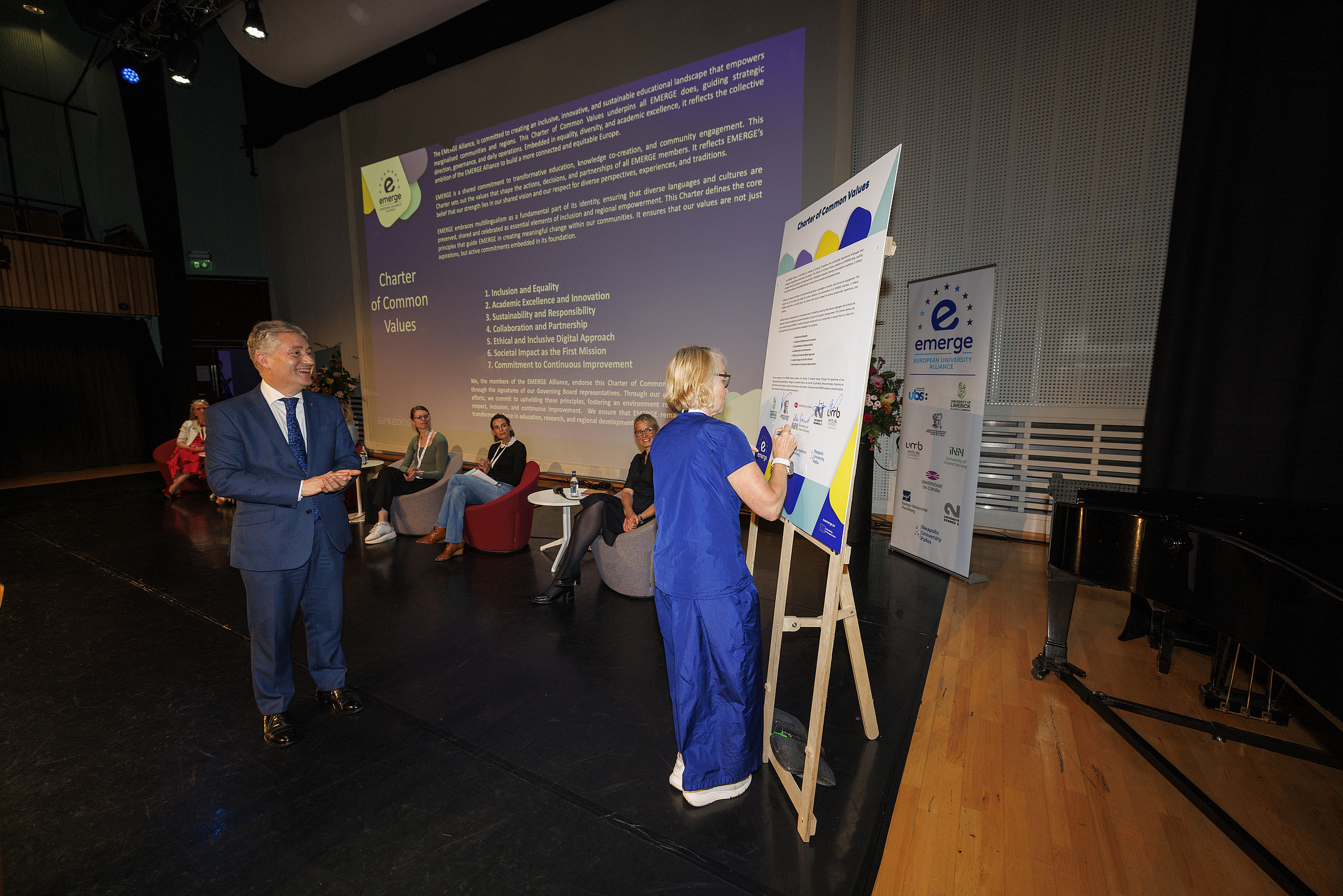 Die Auftaktveranstaltung begann mit einer Eröffnungsrede und einem Vortrag der University of Limerick, der die aktuelle weltpolitische Lage in den Blick nahm und die daraus entstehenden Herausforderungen für Hochschulen in Europa und weltweit thematisierte. Anschließend stellten Vertreter*innen aller Partnerhochschulen ihre ersten Kooperationsideen vor, bevor die gemeinsame Charta feierlich unterzeichnet wurde. Musikalische und tänzerische Beiträge der Studierenden rundeten den Tag ab.