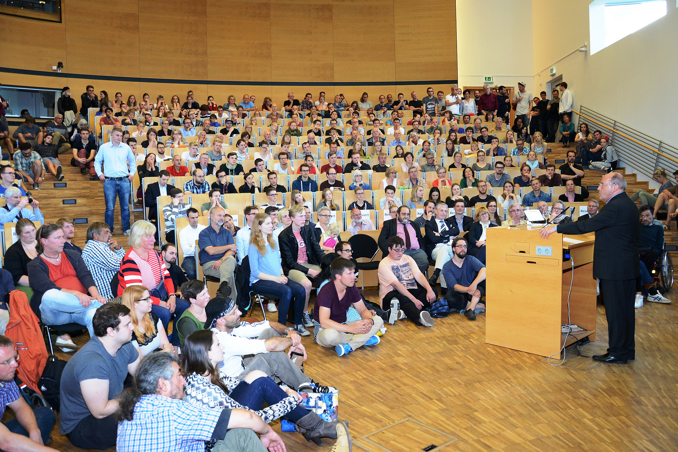 Um 17:45 Uhr mussten die Türen zum Hörsaalgebäude geschlossen werden: Alle drei Hörsäle waren voll besetzt. Rund 800 Menschen waren am Mittwoch, den 13. Juli, auf den Campus Flensburg gekommen, um Gregor Gysi zu sehen, den ehemaligen Fraktionsvorsitzenden der Linken im Bundestag. Der 68-jährige Jurist und Bundestagsabgeordnete sprach über das Verhältnis von Deutschland und Europa. "Die rechten Parteien haben es mit ihrer Kritik an der Europäischen Union zu leicht", sagte Gysi. Es sei zwar richtig: "Die Europäische Union ist unsozial, undemokratisch, nicht nachhaltig, intransparent und bürokratisch". Doch die Antwort der Rechtspopulisten auf diese Missstände, die EU einfach abzuschaffen, sei falsch. Er hält dagegen: Trotz ihrer Mängel müsse man die Europäische Union retten. Denn sie verhindere Kriege zwischen ihren Mitgliedsländern – auf einem Kontinent, der über Jahrhunderte von Kriegen betroffen worden sei. Man müsse die Gründungsideen der Europäischen Vereinigung ernst nehmen: Frieden, Wohlstand und Demokratie. "Wenn man Europa wirklich will", so der Linkenpolitiker, "dürfen diese Ideen nicht ein bloßes Bekenntnis bleiben. Nimmt man diese Ideen nicht ernst, gestaltet man Europa nicht demokratisch und sozial, so wird es zerfallen."