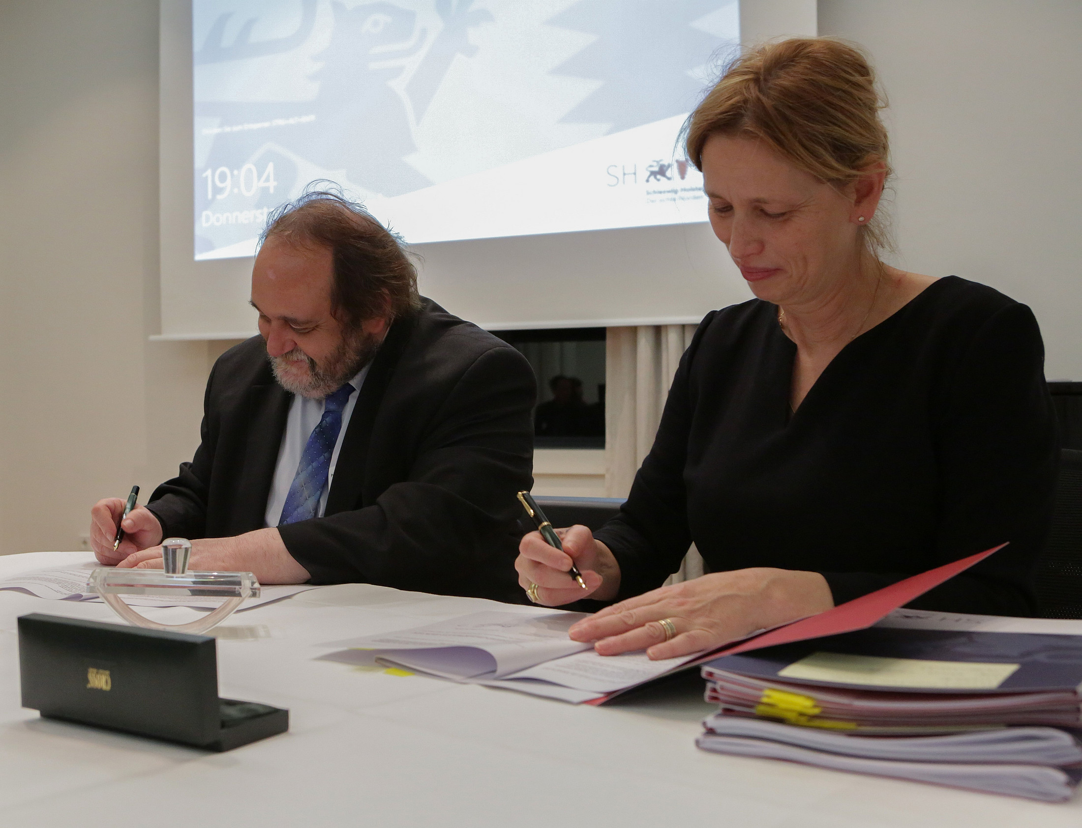 Der Präsident der Europa-Universität Flensburg, Prof. Dr. Werner Reinhart, hat gestern (14.11.) gemeinsam mit den Präsidentinnen und Präsidenten der schleswig-holsteinischen Hochschulen und Wissenschaftsministerin Karin Prien die Ziel- und Leistungsvereinbarungen für die nächsten fünf Jahre unterzeichnet. Für jede Hochschule sind darin individuell verhandelte Anforderungen und Entwicklungsziele festgelegt