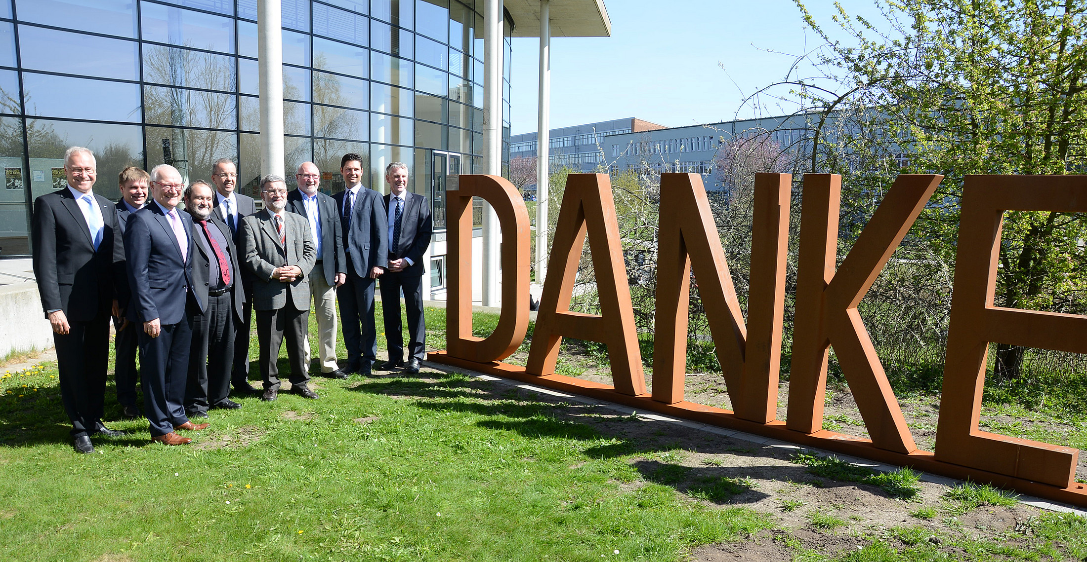 Eine Skulptur aus Stahl mit dem Titel DANKE, die heute der Öffentlichkeit übergeben wurde, drückt die Anerkennung der Hochschulen für diese nachhaltige Unterstützung aus. "Durch das monumentale DANKE dokumentieren wir und erinnern gleichzeitig das Kollegium und die nachwachsenden Studierendengenerationen daran, dass wir als Hochschule für angewandte Wissenschaften mit regionalem Bezug auf die enge und gute Zusammenarbeit mit der regionalen Wirtschaft angewiesen sind: Gemeinsam sind wir stark!", sagte Prof. Dr. Holger Watter, Präsident der FH Flensburg. Der Hochschulförderfonds und die Mitglieder des Beirates unterstützten hier in besonderer Weise bei grenzüberschreitenden und hochschulübergreifenden Projekten, etwa das Dr. Werner Jackstädt-Zentrum für Unternehmertum und Mittelstand oder die Anschaffung wirtschaftswissenschaftlicher Literaturdatenbanken, so Watter: "DANKE für die Unterstützung bei der Positionierung und Weiterentwicklung unseres Hochschulstandorte."