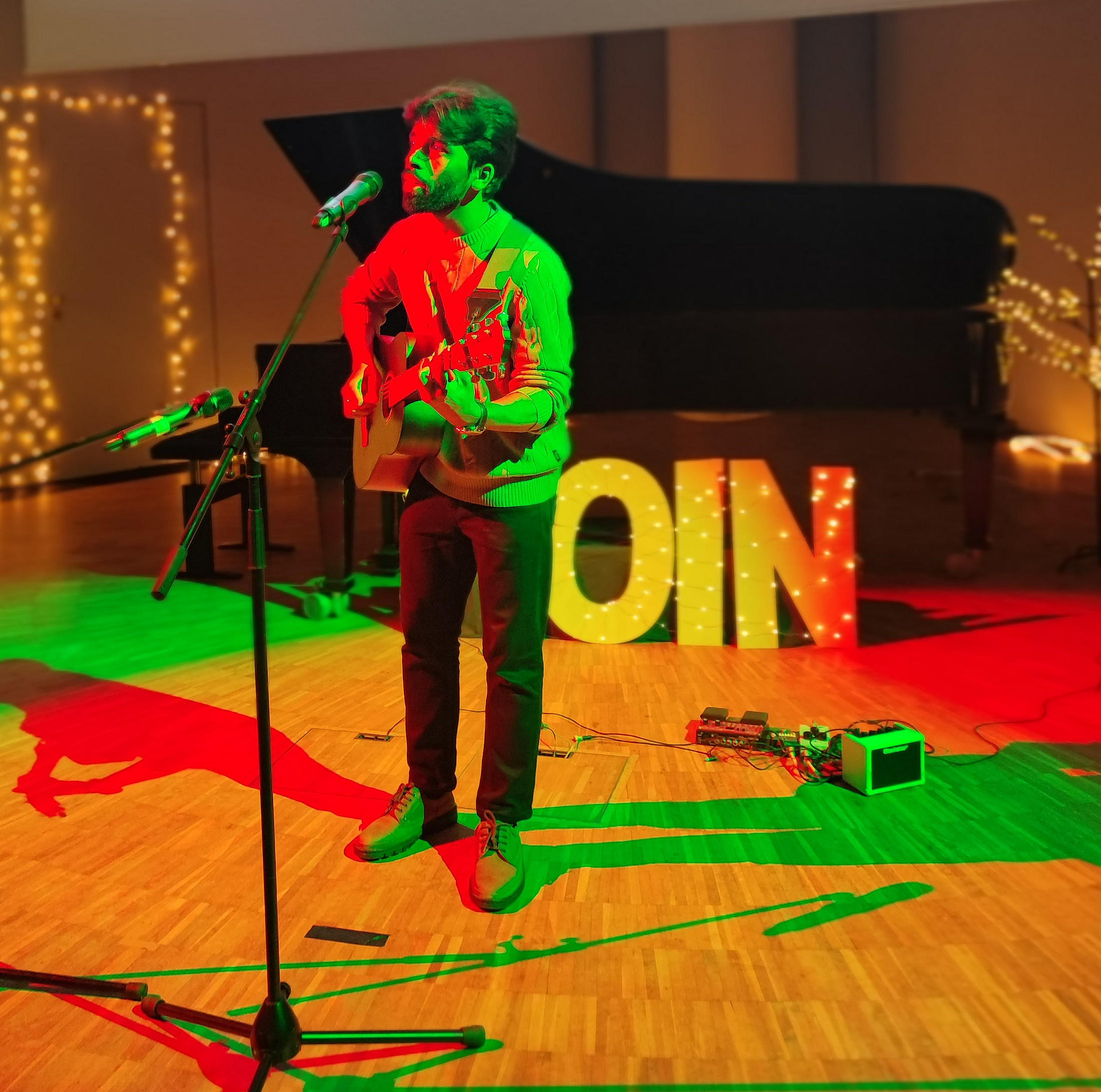 Den Auftakt machte Muhammad Taha Siddiqui aus Pakistan, Student an der Hochschule Flensburg mit zwei Songs zur akustischen Gitarre: "Tum or Main" in Urdu und "I can't go". Er begleitete im nächsten Programmpunkt Sanika Abhyankar, indische Masterstudentin im Studiengang "Kultur – Sprache – Medien", die den Hindi song "Laagi laagi re lagan chitchor" sang. Yasin Dönmez, türkischer Teilnehmer des "Programm zur Studienvorbereitung und -integration von Geflüchteten", spielte auf der Violine das Stück "Miisirlou" aus seiner Heimat Anatolien.