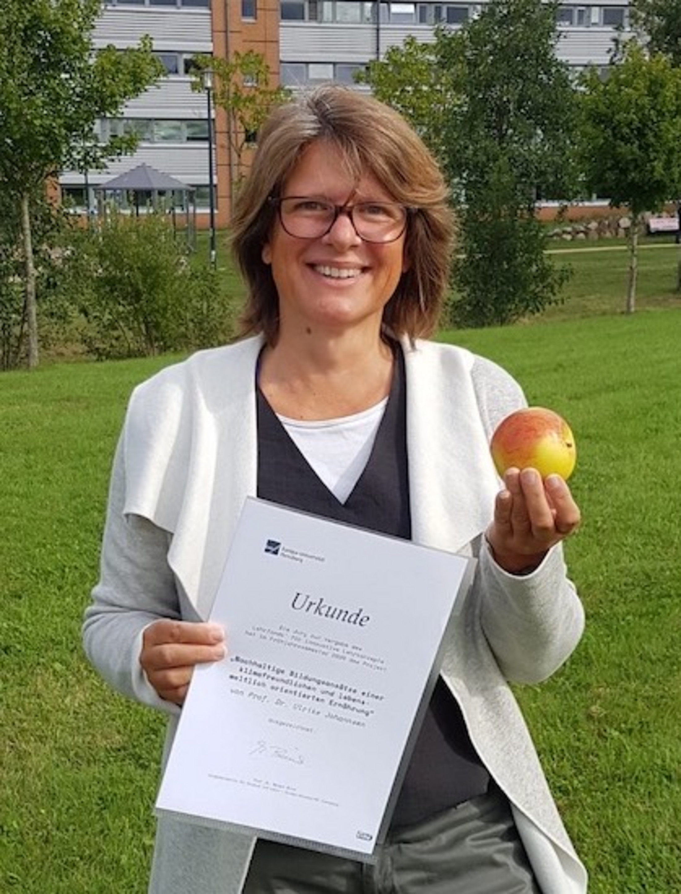 In Deutschland gehen insgesamt über 12 Millionen Tonnen Nahrungsmittel pro Jahr verloren. "Dies entspricht fast einem Drittel des aktuellen Nahrungsmittelverbrauchs der Bundesrepublik", sagt Ulrike Johannsen, Professorin für Ernährungs- und Verbraucherbildung an der Europa-Universität. "Ein großer Teil dieser Verluste wäre heute vermeidbar – etwa durch verbessertes Management entlang der Wertschöpfungskette, veränderte Konsumgewohnheiten sowie die Konzeption neuer klima- und ernährungsbezogener Bildungsansätze." In deutsch-dänischer Kooperation mit Studierenden des University College Syddanmark entwickelt sie im Rahmen des Seminars "Nachhaltige Bildungsansätze einer klimafreundlichen und lebensweltlich orientierten Ernährung" im Bachelorstudiengang Bildungswissenschaften Informations- und Lehrmaterialen, die an verschiedenen Bildungseinrichtungen wie etwa Volkshochschulen, Kitas, Schulen, Krankenkassen, Freizeiteinrichtungen, Jugendzentren etc. in der Grenzregion eingesetzt werden. Die Jury fand das gewählte Thema relevant und aktuell und begrüßte zudem den Service Learning Charakter der grenzüberschreitenden Lehrveranstaltung.