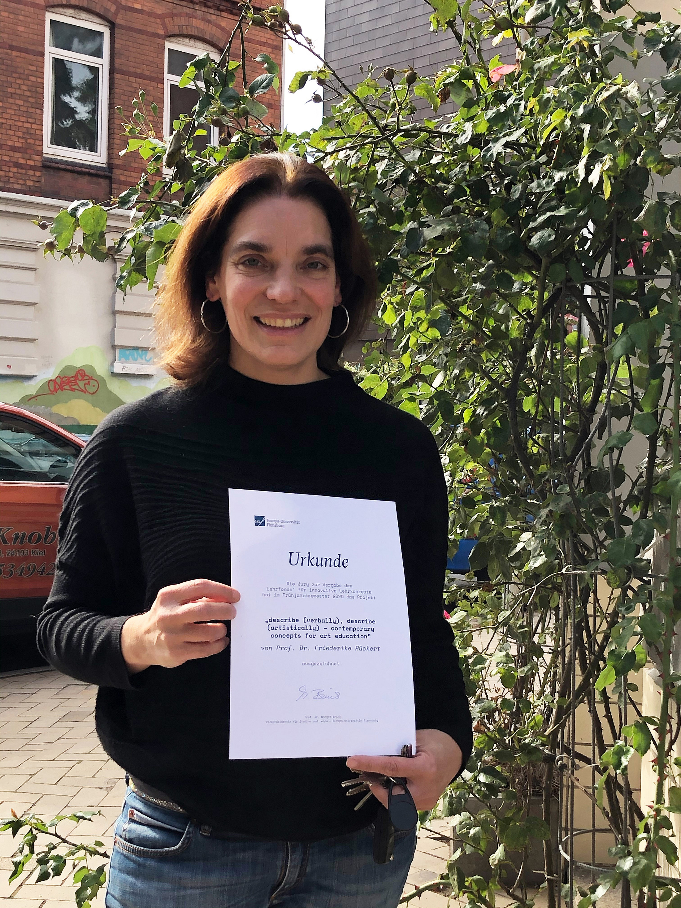 "Digitale Bilder sind omnipräsent", erläutert Friederike Rückert, Professorin für Kunstpädagogik / Bildende Kunst an der Europa-Universität Flensburg. "Sie werden zunehmend globaler und zunehmend bewegter. Ein sicherer und kompetenter Umgang mit digitalen stehenden oder Bewegtbildern, also die Fähigkeit, Bilder richtig lesen und deuten zu können und Verantwortung für die eigene Bildproduktion zu übernehmen, wird für Kinder und Jugendliche zunehmend wichtiger." In der englischsprachigen Lehrveranstaltung "describe (verbally), describe (artistically) – contemporary concepts for art education" im Bachelorstudiengang Bildungswissenschaften steht daher die Förderung von Bildkompetenz bzw. "visual literacy" im Mittelpunkt. Die Studierenden entwickeln Unterrichtseinheiten, die im Anschluss in englischer Sprache an Partnerschulen in Neumünster und Flensburg erprobt werden. Die Jury fand die Frage der "visual literacy" gesellschaftlich zeitgemäß, relevant und darüber hinaus durch den Transfer in die Schulen höchst anwendungsbezogen.