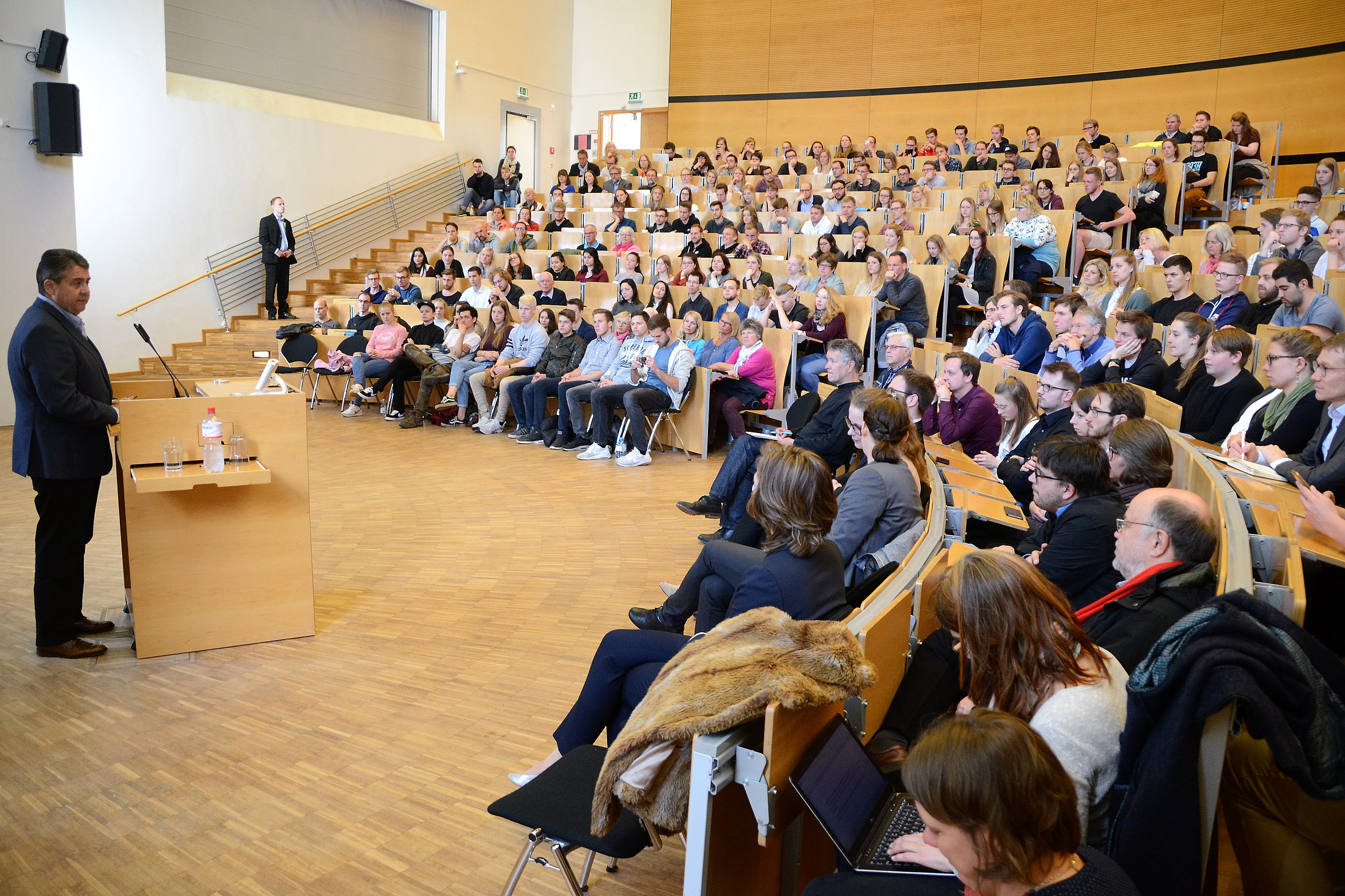 Für seine rund 30-minütige Rede vor Studierenden und Lehrenden erhielt Gabriel viel Beifall. In der anschließenden Diskussion wurden seine Thesen kritisch befragt. OB die EU nicht ein Modell für Solidarität und Toleranz in der Welt sein könne? "Ja", antwortete Gabriel. "Aber nur gemeinsam." Und Gemeinsamkeit entstünde nur, wenn die Deutschen ihre Vorherrschaft hinterfragten. Wie er das Verhältnis zu Trump einschätze? "Das Verhältnis zu den USA wird nie mehr so sein wie früher, weil die Veränderung schon vor Trump begonnen hat", sagte Gabriel. Schon unter Obama hätten die USA sich als pazifische Nation bezeichnet, die transatlantische Achse werde schwächer.