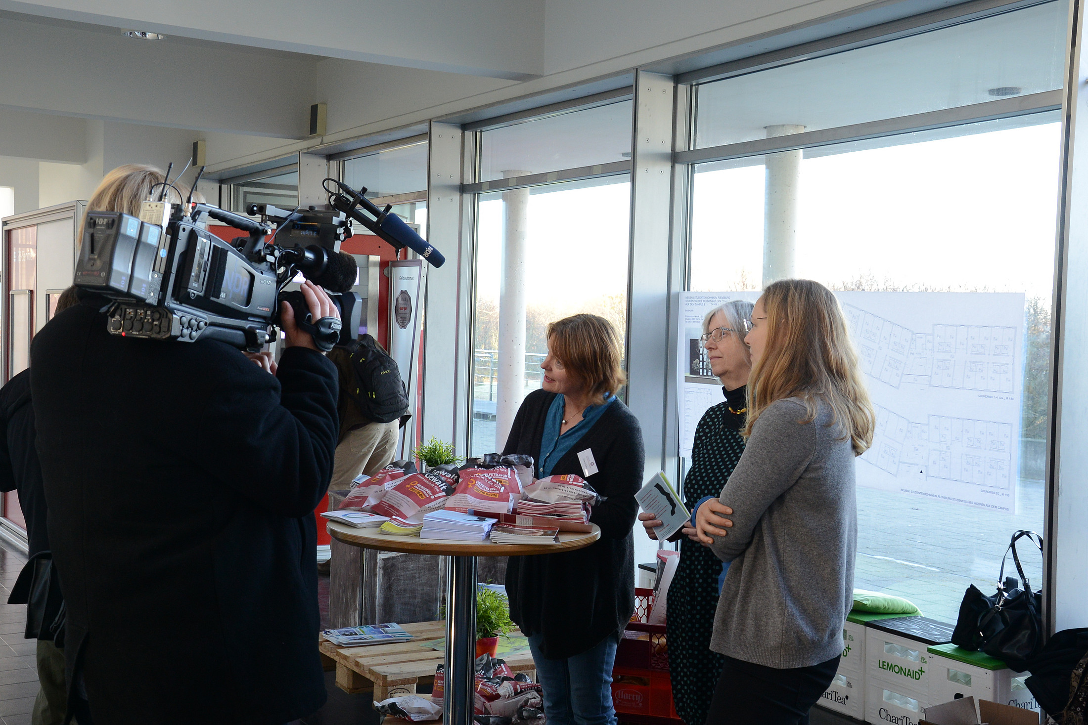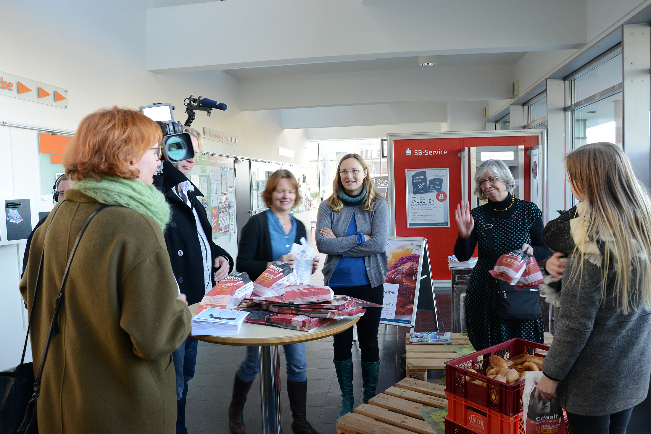 Neben der Flaggenaktion und den besonderen Tüten, in denen die Cafeteria an diesem Tag ihren Gästen Sandwiches, Brote und andere Leckereien mit auf den Weg gab, konnten sich am 25.11.2016 Interessierte im Eingang der Mensa über Gewaltprävention und die Unterstützung von Opfern informieren. Hierfür spendete die Bäckerei Meesenburg zusätzliche Brötchen, die am Tisch verschenkt wurden – eine gute Gelegenheit ins Gespräch zu kommen.