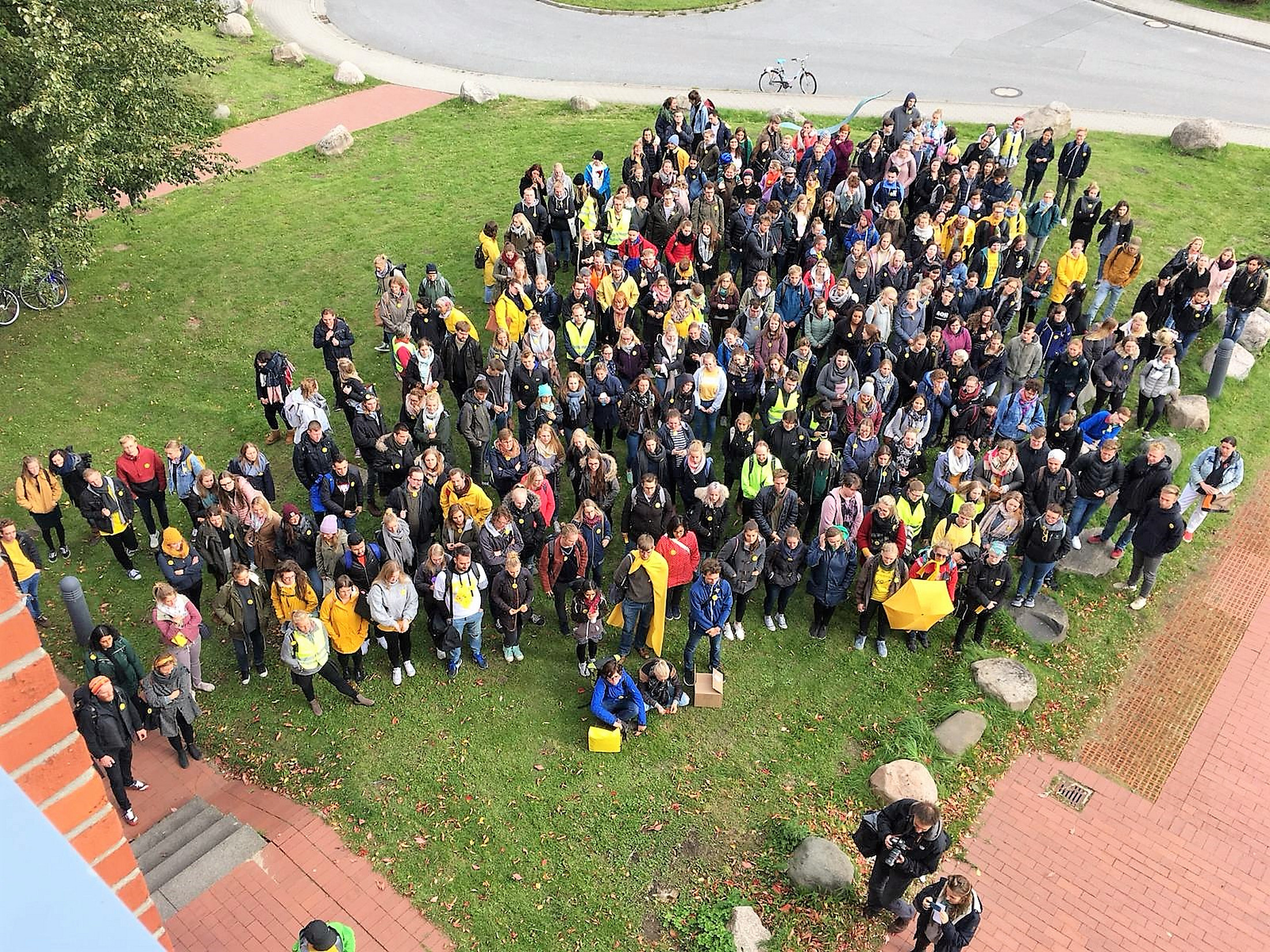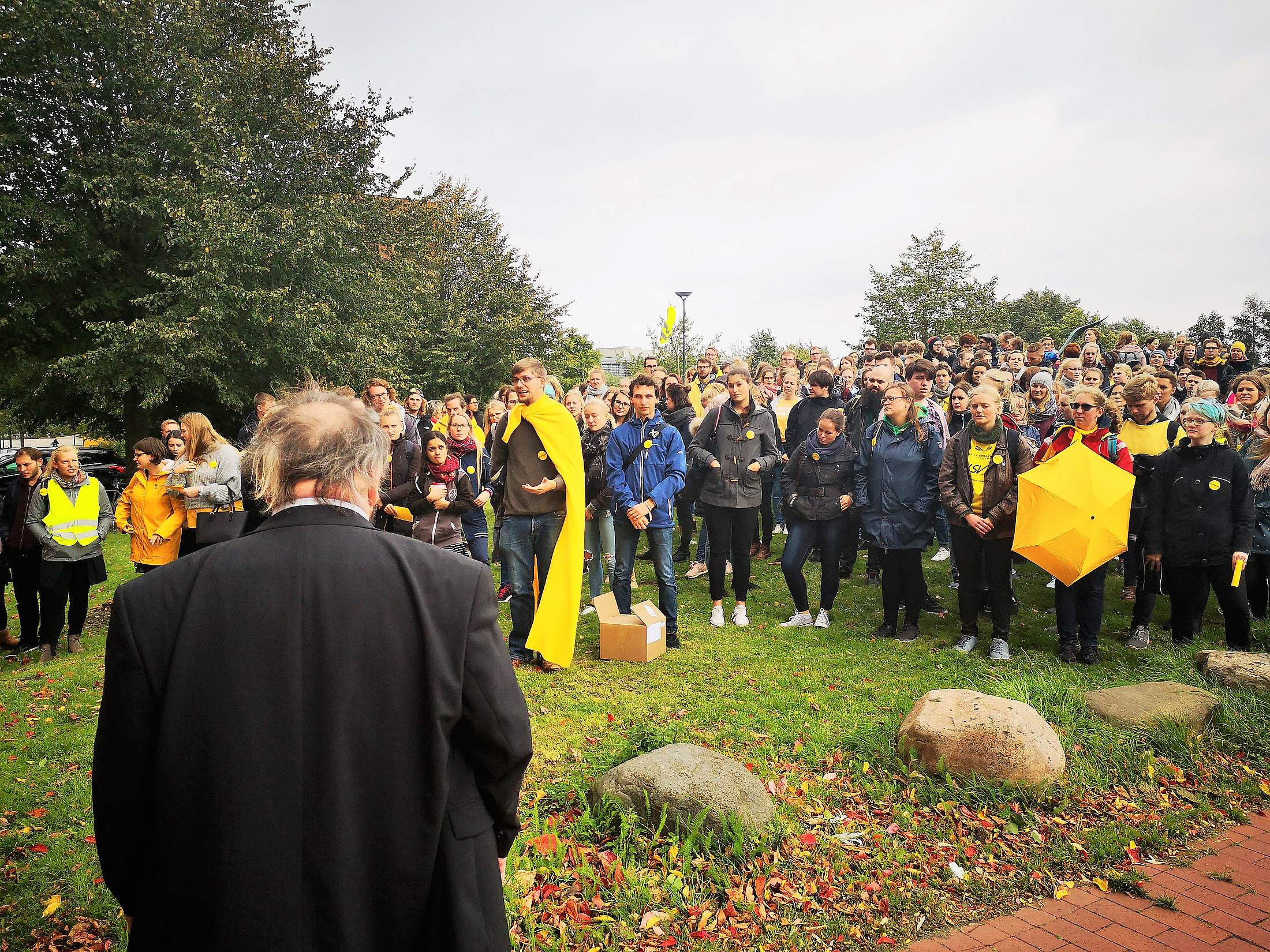 "Wir freuen uns über Studierende, die auf Missstände aufmerksam machen und gute Studienbedingungen einfordern", sagte der Präsident der Europa-Universität Flensburg, Prof. Dr. Werner Reinhart, heute (26.9.2018) anlässlich eines Protestspaziergangs des Allgemeinen Studierendenausschusses (AStA). Der AStA hatte dazu aufgerufen, ein Zeichen zu setzen "gegen überfüllte Veranstaltungen, gegen E-Mailfluten im Postfach, gegen fehlende Praktikumsplätze, gegen die Hilflosigkeit eines großen Systemfehlers." Rund 200 gelb gekleidete Studierende überreichten dem Präsidenten gelbe Blumen, die Botschaft: "Wir stehen kurz vor Rot!"