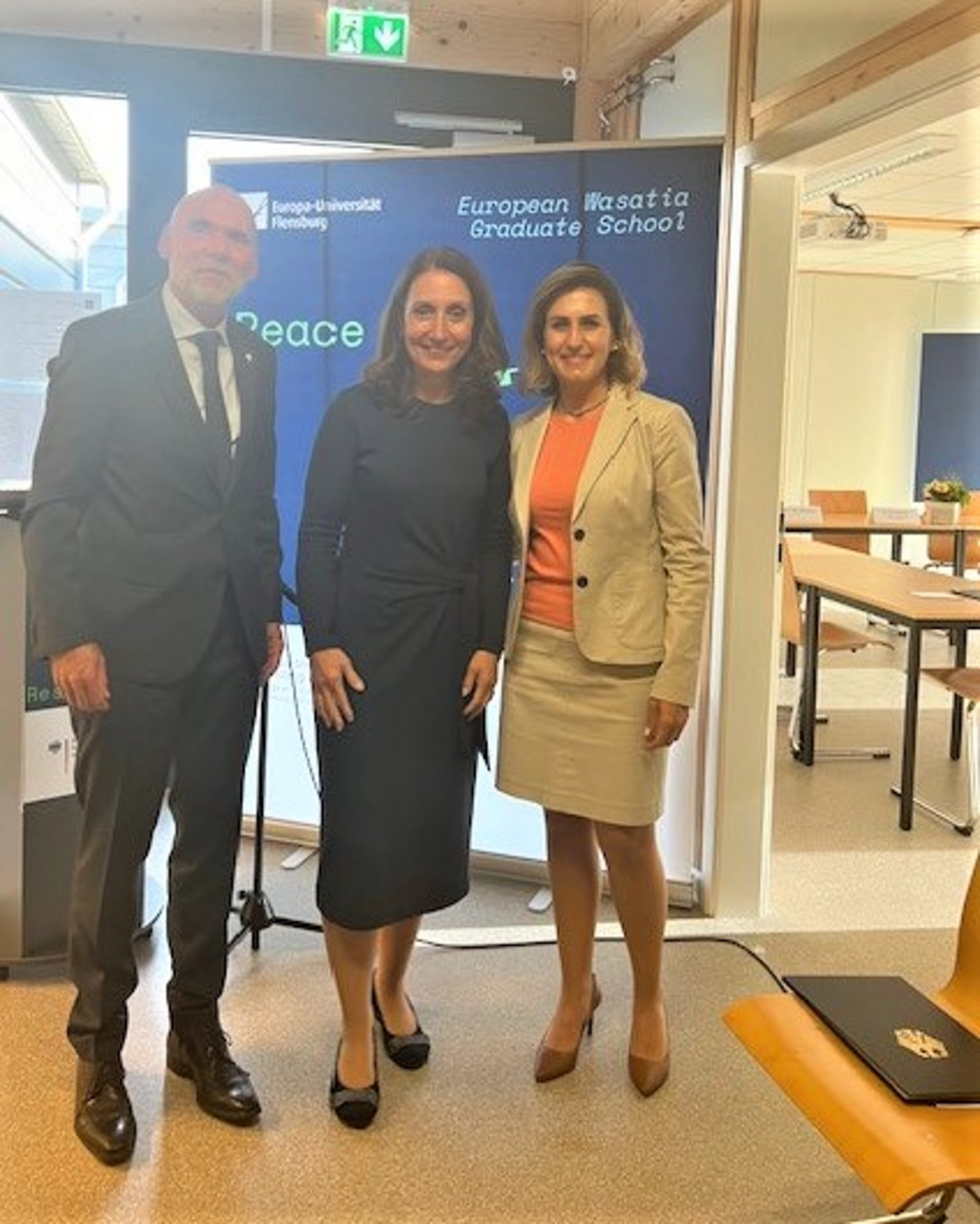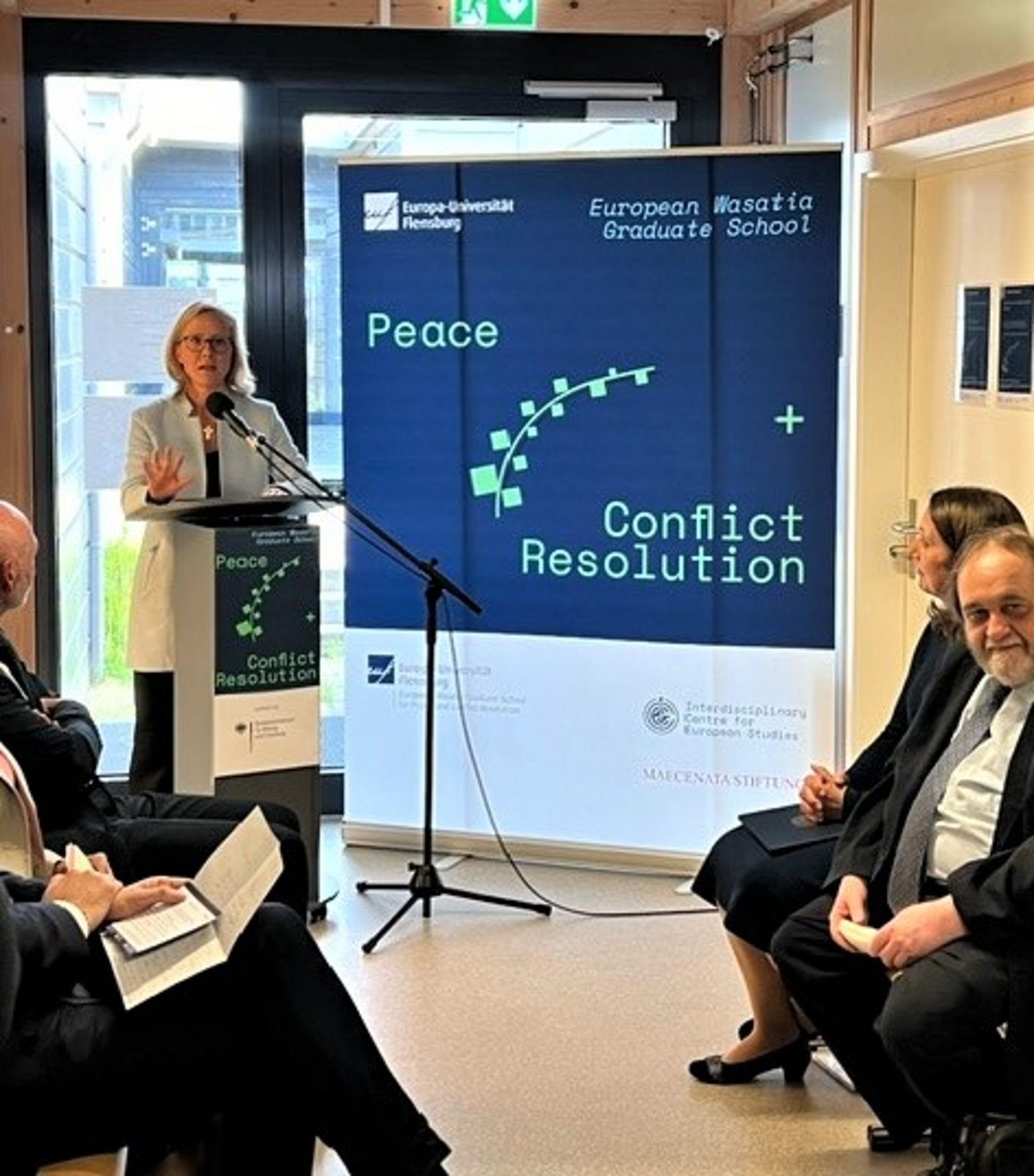 Die European Wasatia Graduate School for Peace and Conflict Resolution an der Europa-Universität Flensburg (EUF) hat am Mittwoch, 29.05.2024, die zweite Kohorte von Studierenden begrüßt. Insgesamt wurden 13 Studierende aus Israel, Palästina, Albanien, Südafrika, Jemen, Irak, Serbien und Deutschland begrüßt. An dem feierlichen Empfang nahmen auch die Vizepräsidentin des Deutschen Bundestages, Aydan Özoğuz, MdB, die Bischöfin im Sprengel Schleswig und Holstein, Nora Steen, und Universitätspräsident Prof. Dr. Werner Reinhart teil.