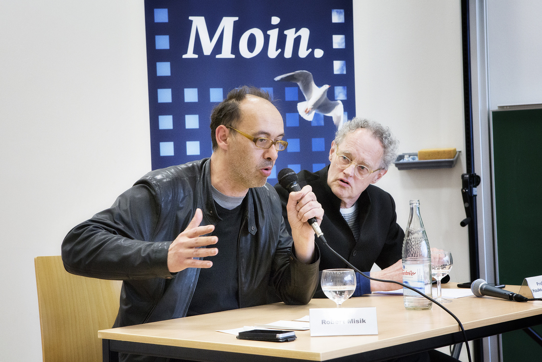 Europa habe keine Verfassung, Europa sei in einem Zustand – so beschrieb der österreichische Journalist und Autor Robert Misik die Krise der Europäischen Union. Misik war einer von fünf Teilnehmenden einer Diskussion im Rahmen der diesjährigen Europawoche an der Europa-Universität Flensburg (EUF). Unter dem Titel "Moin Europe" beschäftigten sich knapp 30 Veranstaltungen zwei Tage lang mit Geschichte, Gegenwart und Zukunft der Europäischen Union. Young European Federalists of Flensburg diskutierten die Frage, welche Rolle junge Menschen in der EU einnehmen könne, Studierende des Studiengang "European Cultures and Society" entwickelten Visionen, wie die EU 2050 aussehen könnte – zerfallen oder gestärkt? - , Lehrende sprachen über den neuen Autoritarismus in der Türkei oder das Image Dänemarks als gemütlichem Glücksstaat.