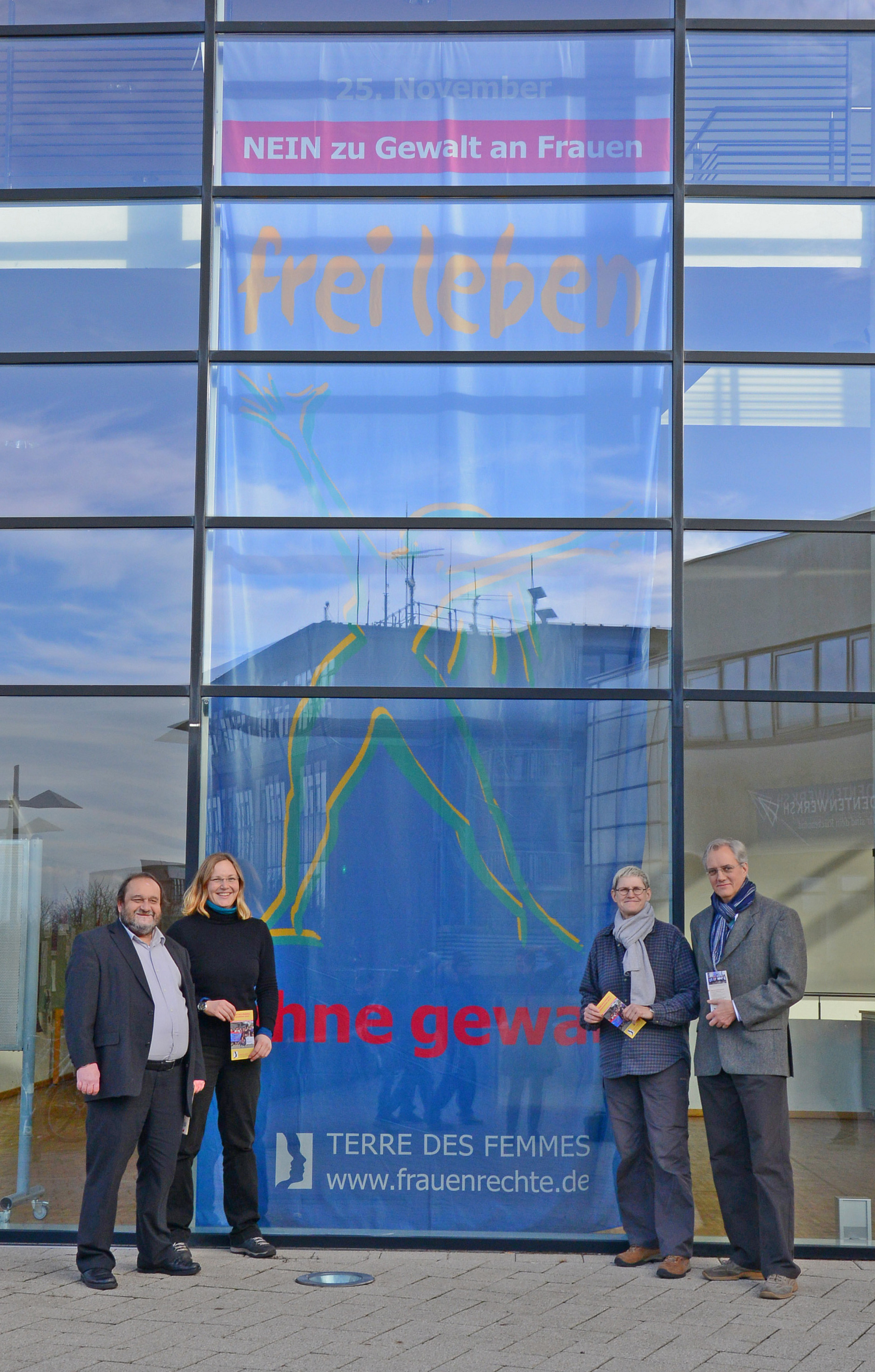 Anlässlich der von der Menschenrechtsorganisation TERRE DES FEMMES initiierten Fahnenaktion machen auch Mitglieder der Präsidien von Europa-Universität Flensburg und Fachhochschule Flensburg sowie die Gleichstellungsbeauftragten beider Hochschulen bereits am Montag, dem 23. November, auf das Schwerpunktthema 2015 aufmerksam: Prof. Dr. Werner Reinhart, Präsident der Europa-Universität Flensburg, und Martin von Schilling, Vizepräsident für internationale Beziehungen an der Fachhochschule Flensburg, erläutern das Engagement des Flensburger Campus: "Wir möchten diese Gelegenheit nutzen, um Flagge zu zeigen und ein Zeichen dafür zu setzen, dass Frauen weltweit und in Deutschland friedlich und selbstbestimmt leben könne. Als Bildungseinrichtungen kommt uns dabei eine besondere Rolle zu."