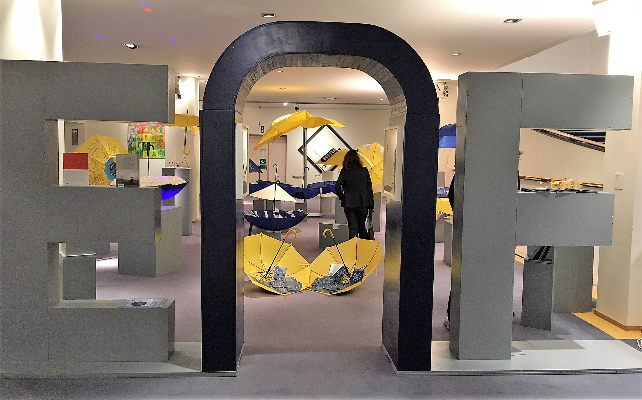 Für die Ausstellung haben sich etwa 15 Studierende des englischsprachigen Bachelor-Studiengangs "European Cultures and Society" (EUCS) in dem Schwerpunkt "Doing Europe: Art and Scenography" unter Leitung von Matthias Bauer, Professor für neuere deutsche Literaturwissenschaften, und Werner Fütterer, Lehrkraft für besondere Aufgaben im Fach Bildende Kunst, künstlerisch mit ihren Haltungen zur gegenwärtigen Europapolitik und zu europäischen Werten auseinandergesetzt. Herausgekommen ist ein "EUF-Tor", das die EU und die EUF miteinander verbindet und durch das die Besucherinnen und Besucher in einen "Regenschirm-Park" eintreten. "Europa ist vor allem ein Oberbegriff, der viele verschiedene Länder, Kulturen und Gemeinschaften umfasst. Daher bietet sich die Schirmform als emblematische Darstellungsform an", begründen die Studierenden aus Bulgarien, Deutschland, Indien, Mexiko, Pakistan, Rumänien, Ukraine und Südafrika ihre Objektwahl in der Ausstellungs-Broschüre. Auf den umgedrehten Schirmen visualisieren sie bildnerisch ihre Reflexionen zu dem Umgang mit den sogenannten "Anderen", zur Rolle der EU als Schutzraum und Grenze für Geflüchtete, aber auch zu Themen wie "Big Data", Frauenrechten, Pressefreiheit etc.