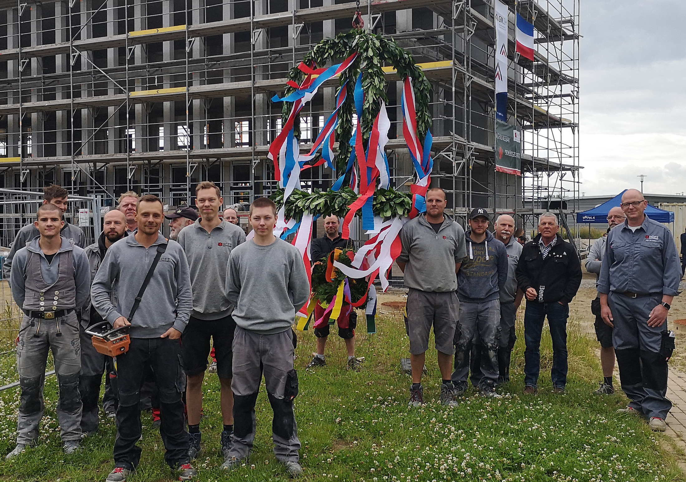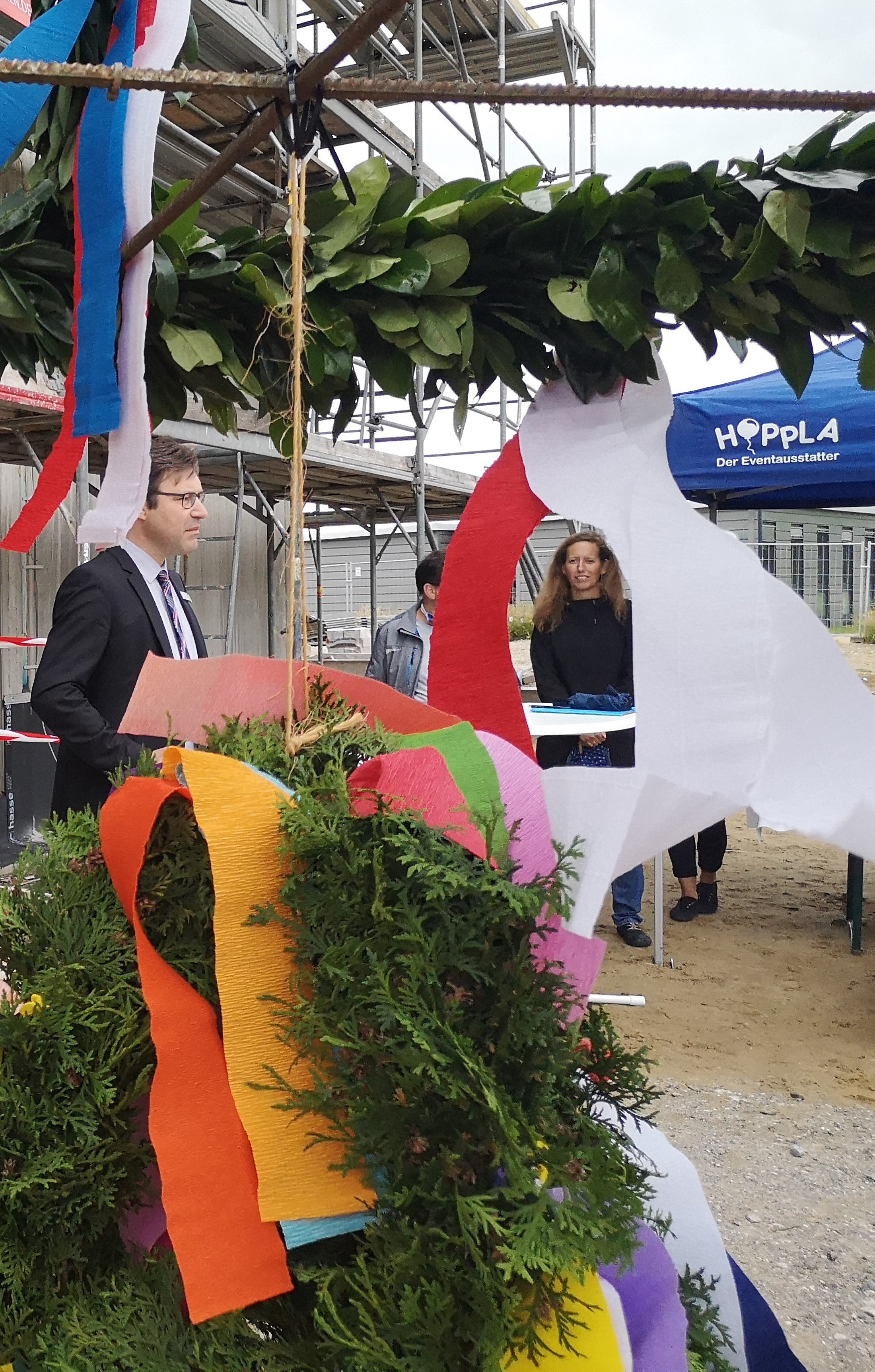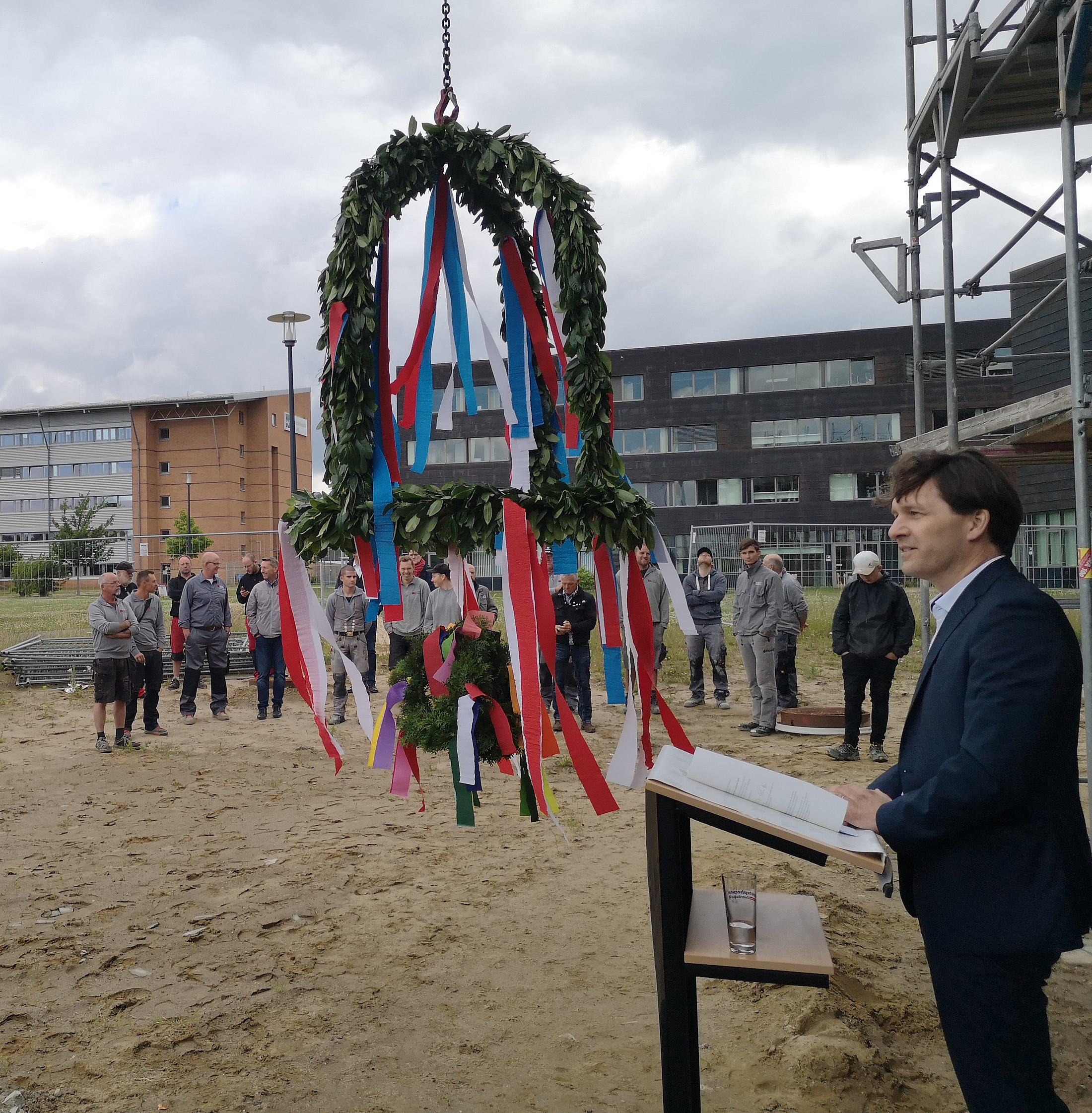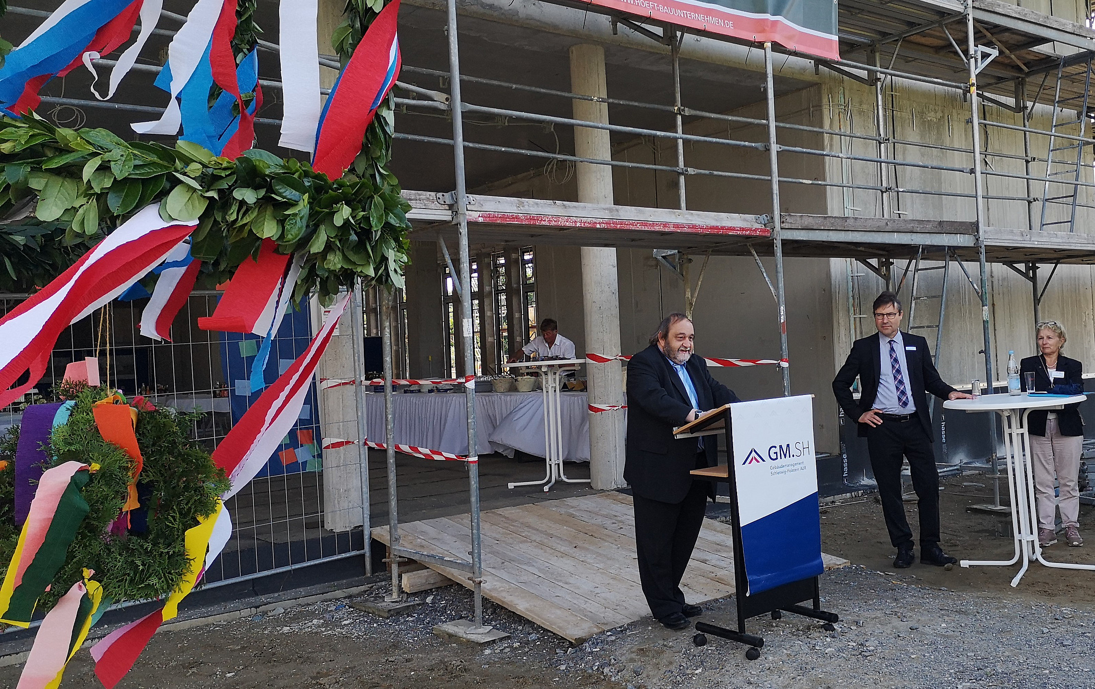 "Dieser Neubau ist viel mehr für uns als nur ein Bau", betonte der Präsident der Europa-Universität Flensburg, Prof. Dr. Werner Reinhart, in seinem Grußwort. "Dieses Gebäude mit seinen Konferenz- und Gremienräumen, mit seinen Büros und Teeküchen verkörpert auch die Hoffnung auf physische Nähe in einer Zukunft nach Corona. Zugleich markiert es ein geglücktes Profil: Nachgefragte Studiengänge und eine wachsende Anzahl von Lehrenden benötigen Platz und Infrastruktur. Dieses Gebäude verdeutlicht zudem auch gelungene Kooperation und gute Arbeit: Ich danke dem zuständigen Ministerium, der GMSH, dem Gebäudemanagement der EUF und allen Handwerkerinnen und Handwerker, die dazu beigetragen haben, dass zwischen Grundsteinlegung und Richtfest die keineswegs selbstverständliche Spanne von nur sieben Monaten gelegen hat."
