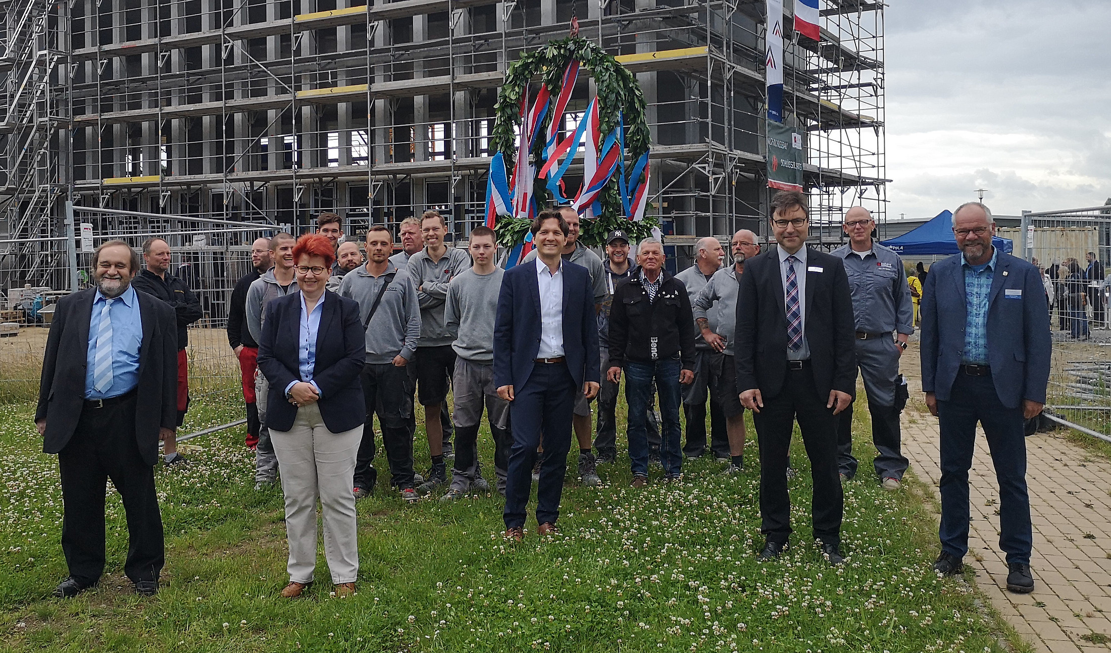 Dr. Oliver Grundei, Universitätspräsident Professor Dr. Werner Reinhart und GMSH-Geschäftsführer Frank Eisoldt gemeinsam mit den Handwerkern das Richtfest.