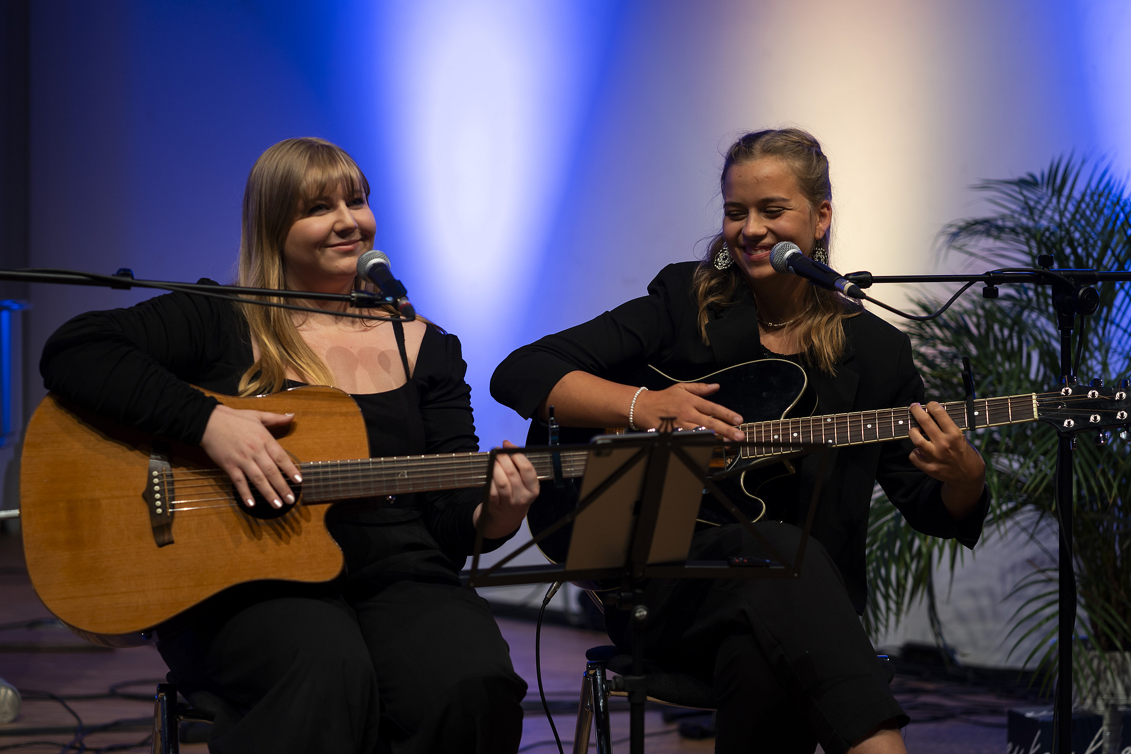 Auch die beiden musikalischen Pop-Duos begeisterten das Publikum. Die Musikstudierenden Lisa Winkler an der Gitarre und Annika Blanke am Klavier als Pop-Duo "Two Souls" sowie Johanna Kühl und Helena Rinne an den Gitarren sorgten mit Coverversionen und eigenen Songs für eine stimmungsvolle musikalische Untermalung des Abends.
