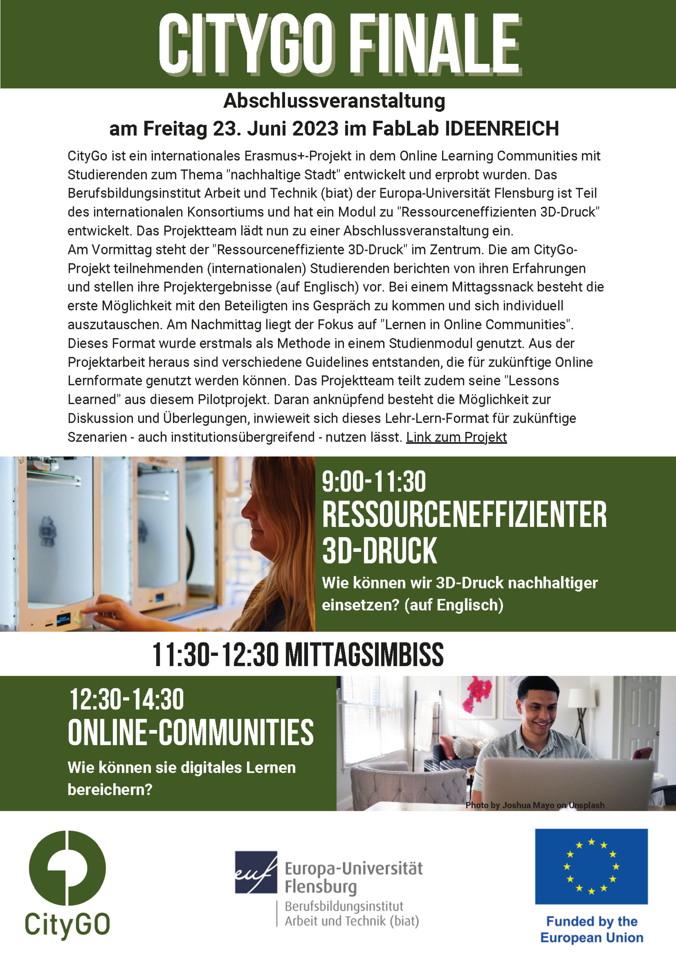 CityGo ist ein internationales Erasmus+-Projekt in dem Online Learning Communities mit Studierenden zum Thema "nachhaltige Stadt" entwickelt und erprobt wurden. Das Berufsbildungsinstitut Arbeit und Technik (biat) der Europa-Universität Flensburg ist Teil des internationalen Konsortiums und hat ein Modul zu "Ressourceneffizienten 3D-Druck" entwickelt. Das Projektteam lädt heute zur Abschlussveranstaltung ein.