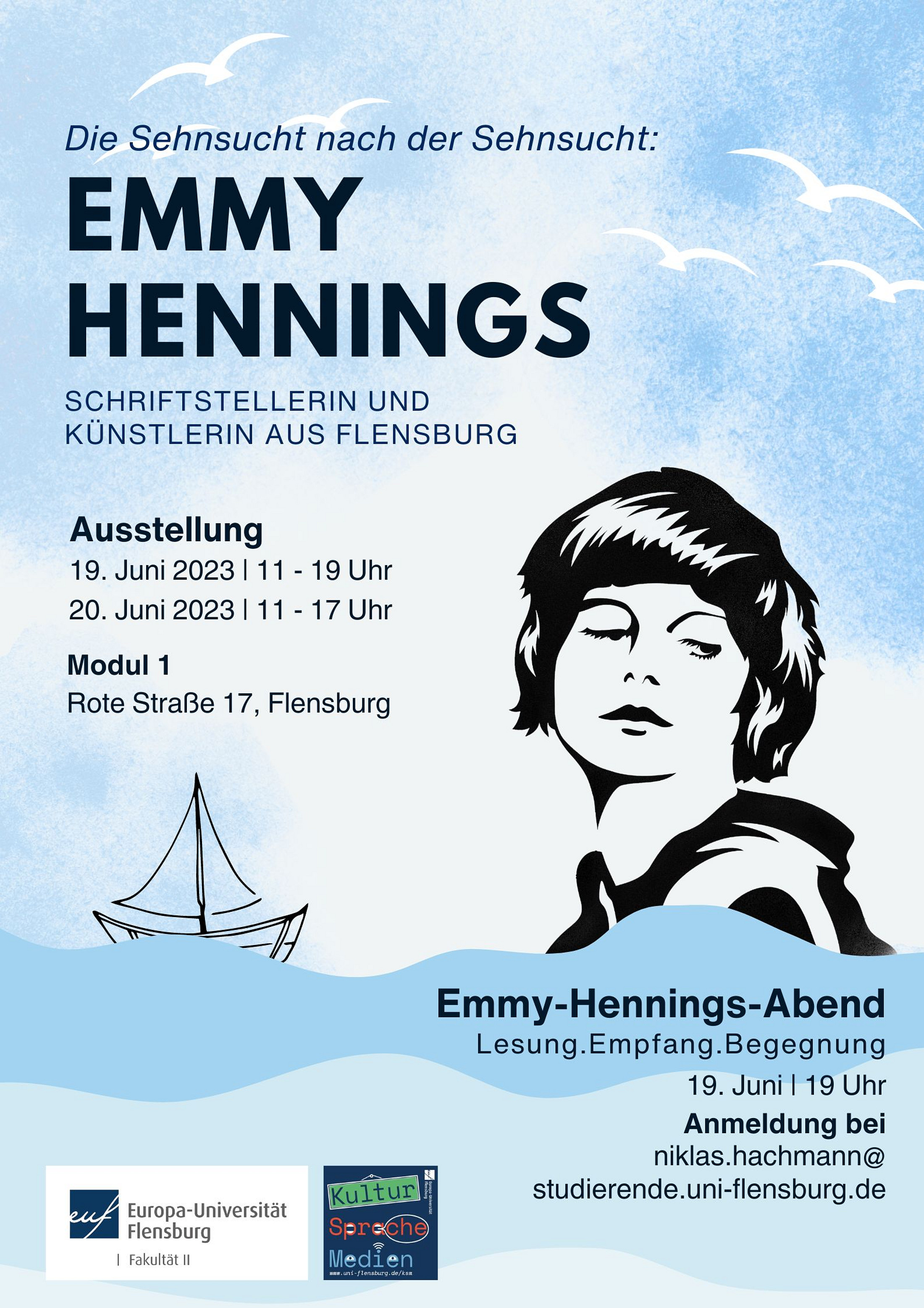 Studierende des Masterstudiengangs "Kultur-Sprache-Medien" und Prof. Dr. Margot Brink von der Europa-Universität Flensburg laden herzlich zu der Ausstellung "Die Sehnsucht nach der Sehnsucht: Emmy Hennings. Schriftstellerin und Künstlerin aus Flensburg" ein.