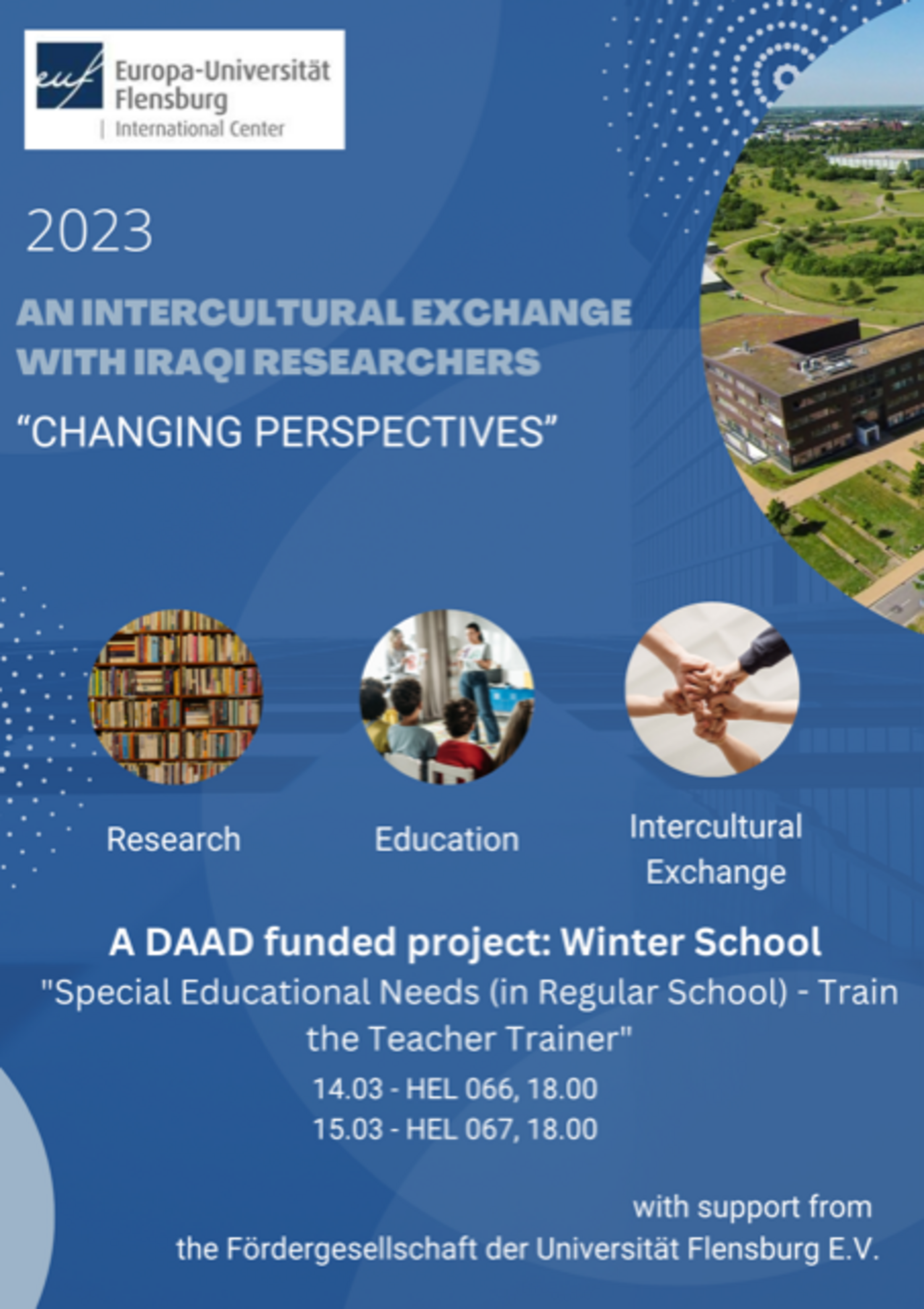 Das International Center der Europa-Universität Flensburg und das Projekt des DAAD Winter School laden zu einem interkulturellen Austausch mit 15 Forscher*innen und Professor*innen von fünf Universitäten aus dem Irak ein, die an der Winter School des vom DAAD geförderten Projekts "Special Educational Needs (in Regular School) - Train the Teacher Trainer" an der Europa-Universität Flensburg teilnehmen.