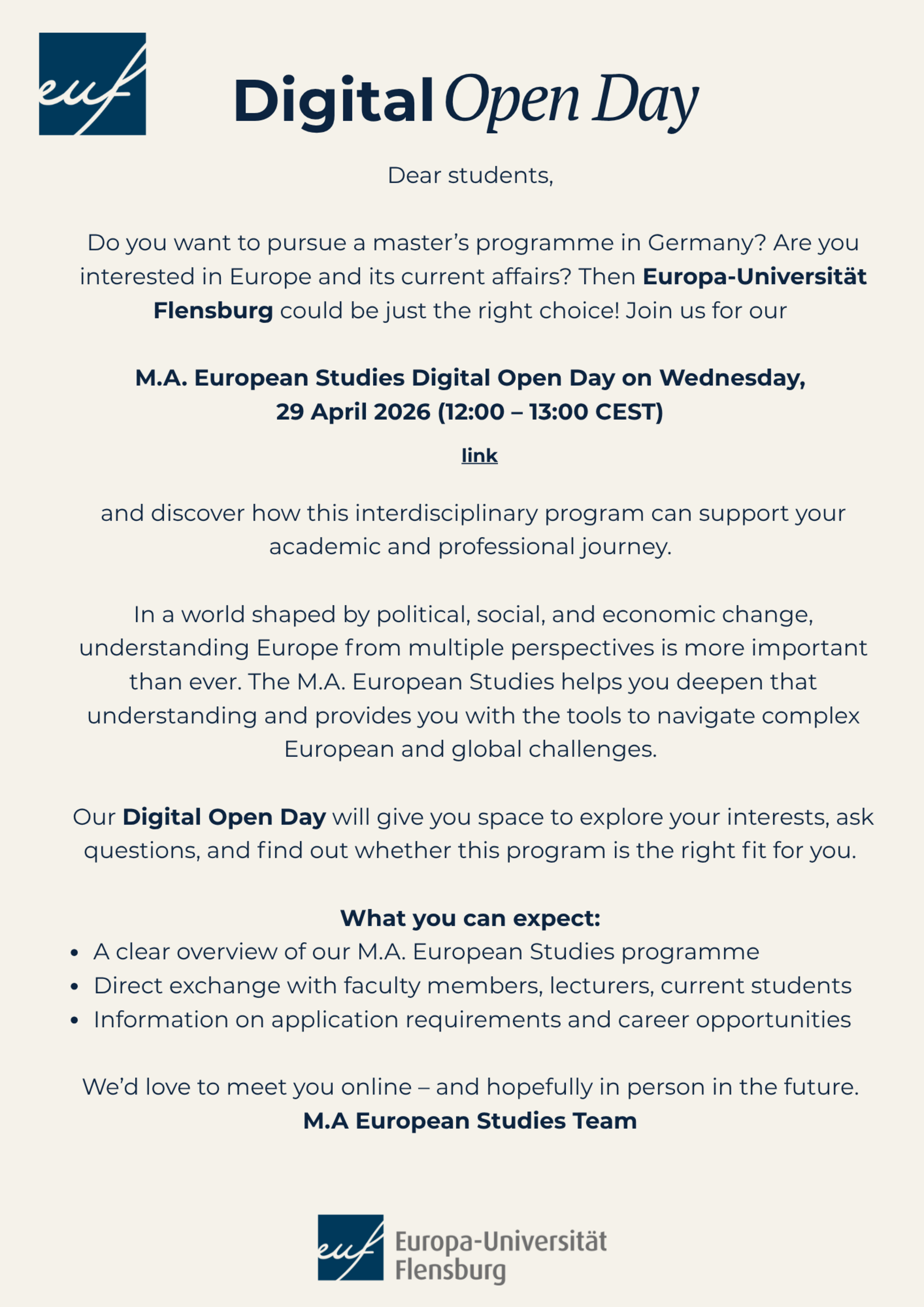 Join us for our M.A. European Studies Digital Open Day and discover how this interdisciplinary program can support your academic and professional journey.