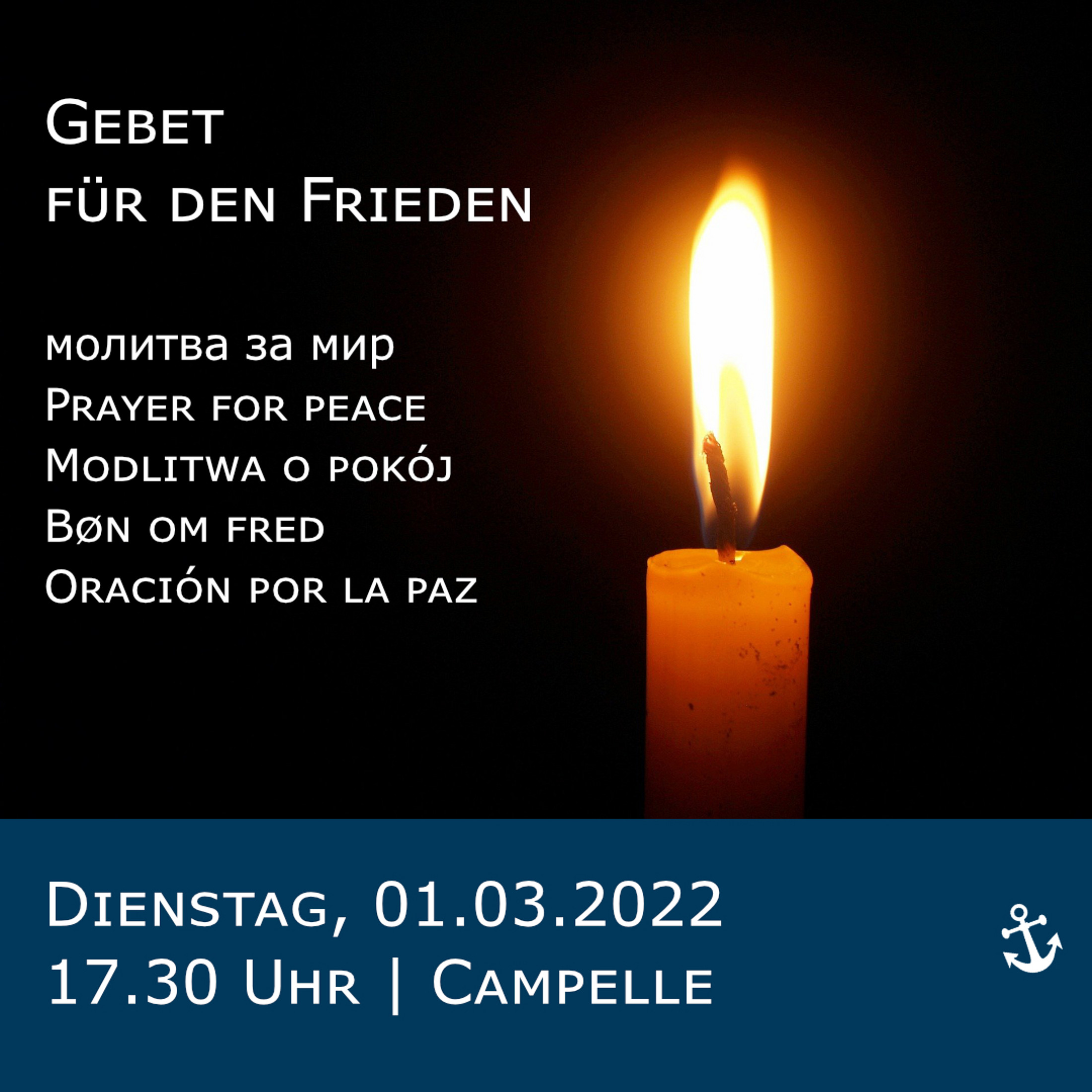 Die Situation in der Ukraine sorgt bei vielen für Ratlosigkeit, Trauer und Angst. Einen Raum für die aktuelle Stimmung und persönliche Gedanken soll ein mehrsprachiges Gebet für den Frieden heute in der Campelle auf dem Flensburger Campus bieten. Die Katholische Hochschulgemeinde (KHG) lädt alle Menschen unabhängig ihres Glaubens und ihrer Herkunft zu einer etwa halbstündigen Andacht mit Stille, Gebet und Musik ein.