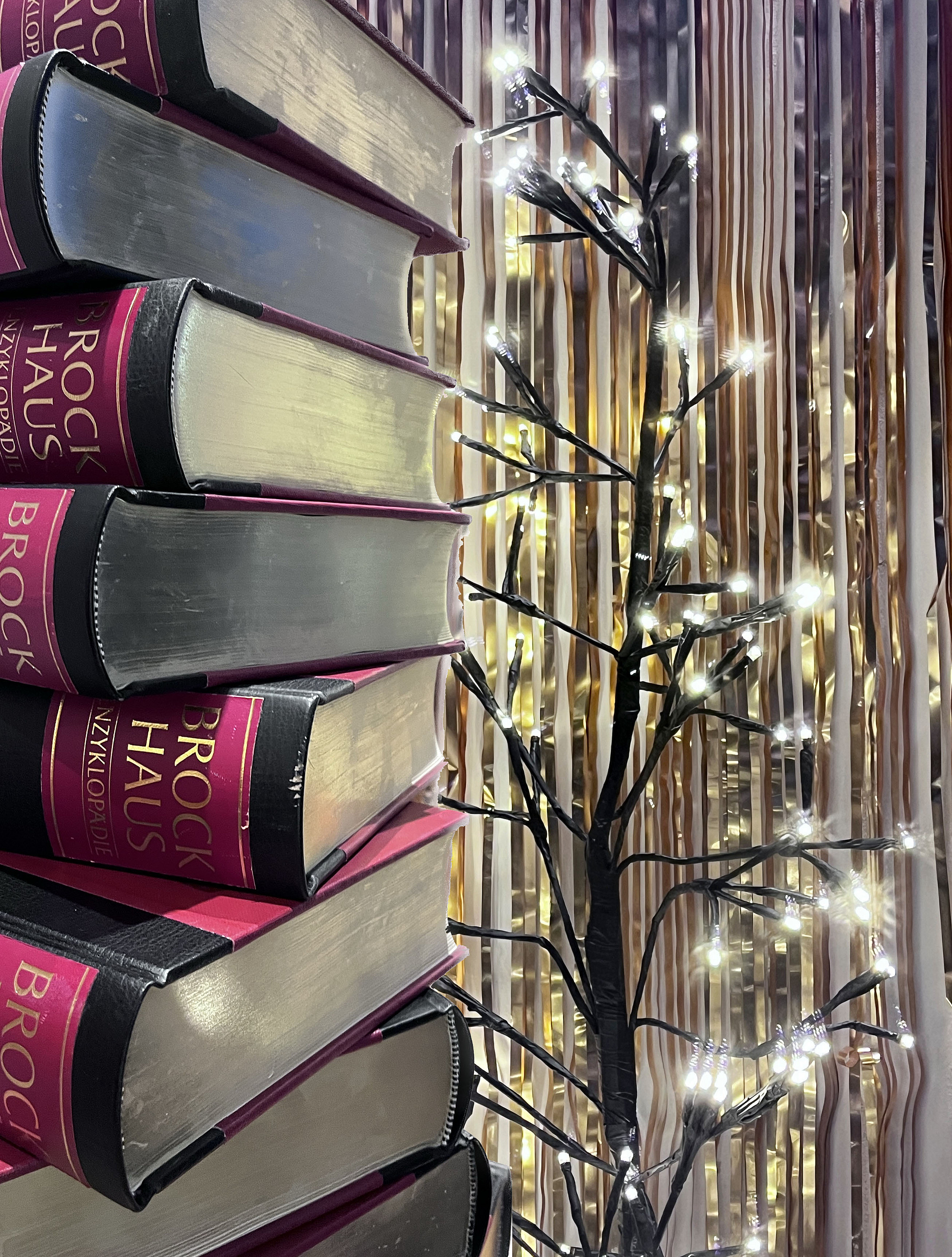 Angelehnt an das berühmte Zitat Loriots in „Weihnachten bei den Hoppenstedts“ besteht die diesjährige weihnachtliche Ausstellung im Showroom des Neubaus TAL an der Europa-Universität Flensburg aus Glitzervorhängen, Luftschlangen, LED-Beleuchtung, Discokugeln und einer Brockhaus Enzyklopädie in 24 Bänden aus dem Jahr 1986.