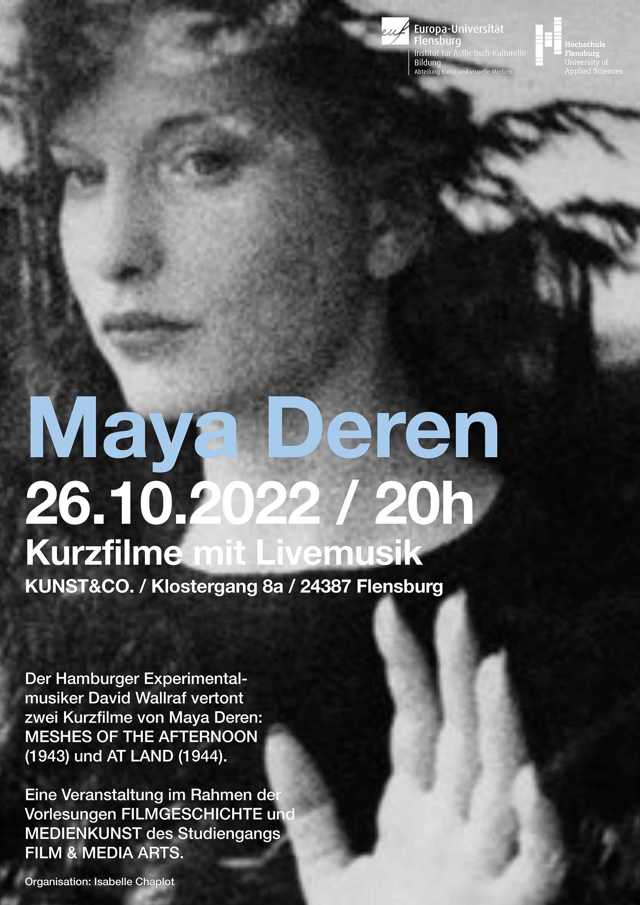 Gezeigt werden zwei Kurzfilme der US-amerikanische Avantgarde-Regisseurin Maya Deren: MESHES OF THE AFTERNOON (1943) – 1947 beim @festivaldecannes mit dem Grand Prix International für 16-mm-Experimentalfilme ausgezeichnet – und AT LAND (1944), die vom Hamburger Experimentalmusiker David Wallraf vertont wurden.
