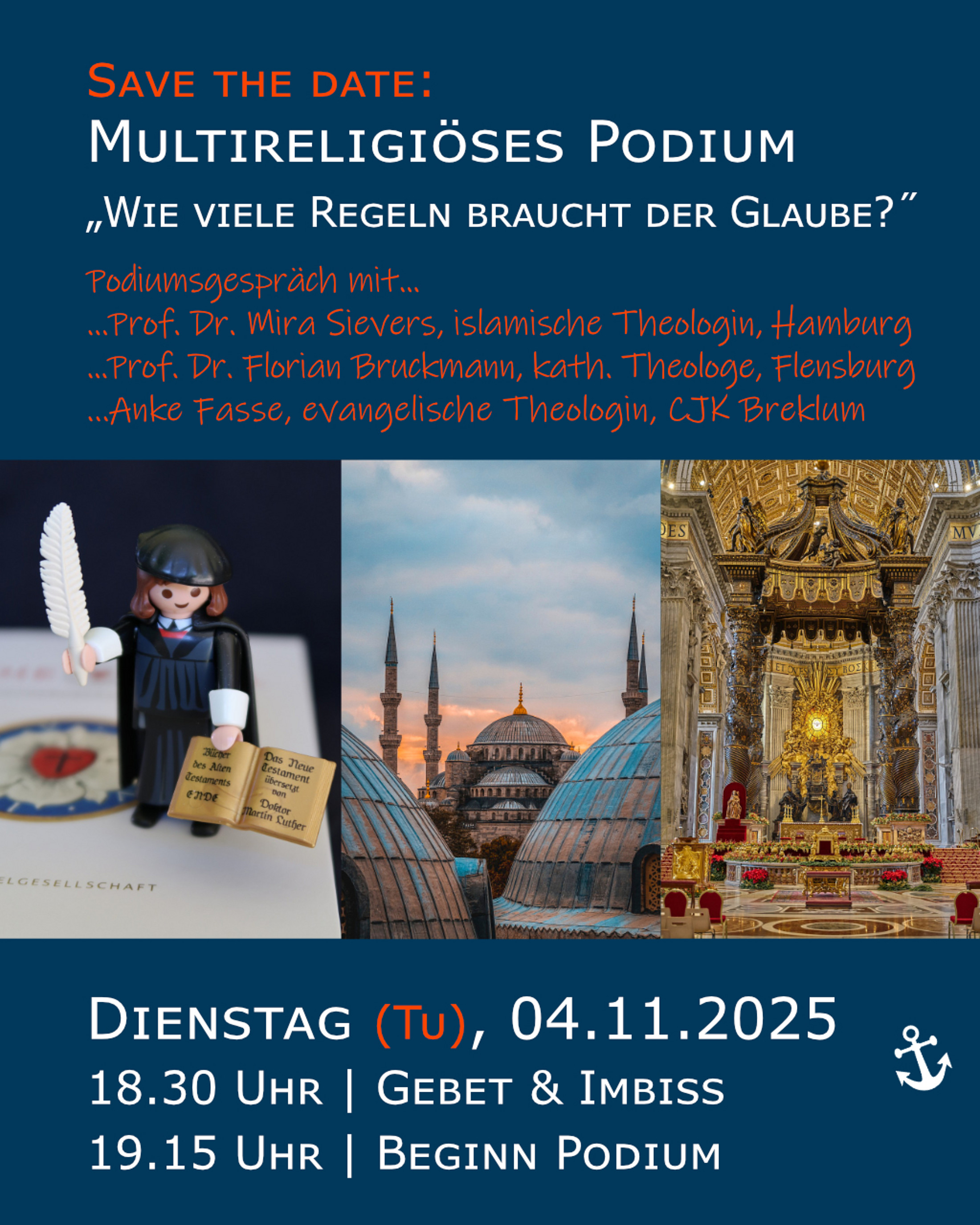 Zu dieser vielseitigen, plakativen und offenen Frage diskutieren ab 19.15 Uhr Prof. Dr. Florian Bruckmann (Kath. Theologe, EUF), Prof. Dr. Mira Sievers (Islamische Theologin, Uni Hamburg) und Anke Fasse (Ev. Theologin, Leiterin Christian-Jensen-Kolleg Breklum) in der Campelle Flensburg.