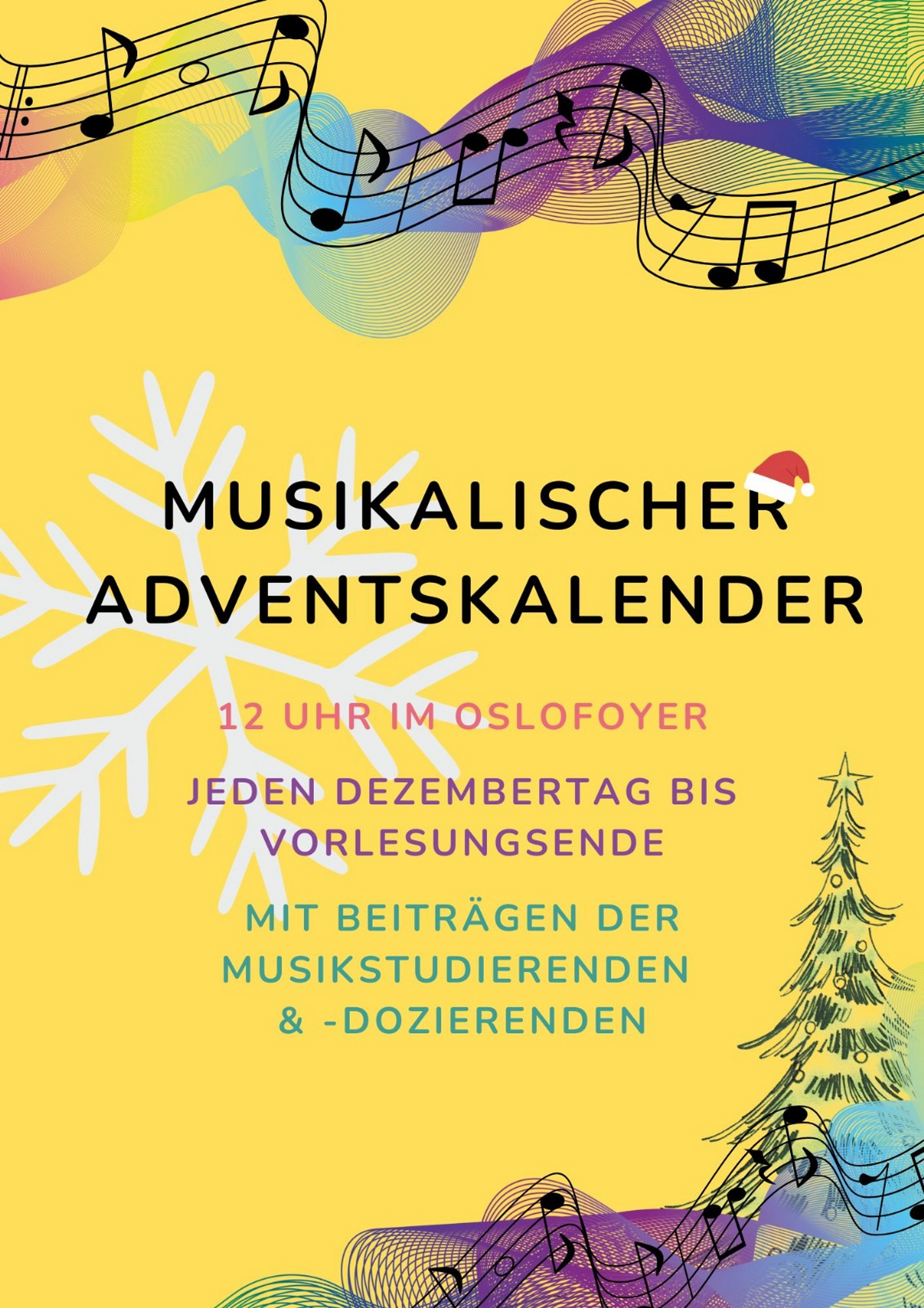 Die Fachschaft Musik lädt jeden Mittag zu einem musikalischen Adventskalender ein. Musikstudierende und Dozierende gestalten täglich (in der Vorlesungszeit, bis einschließlich 12.12.2025) einen kurzen musikalischen Beitrag.