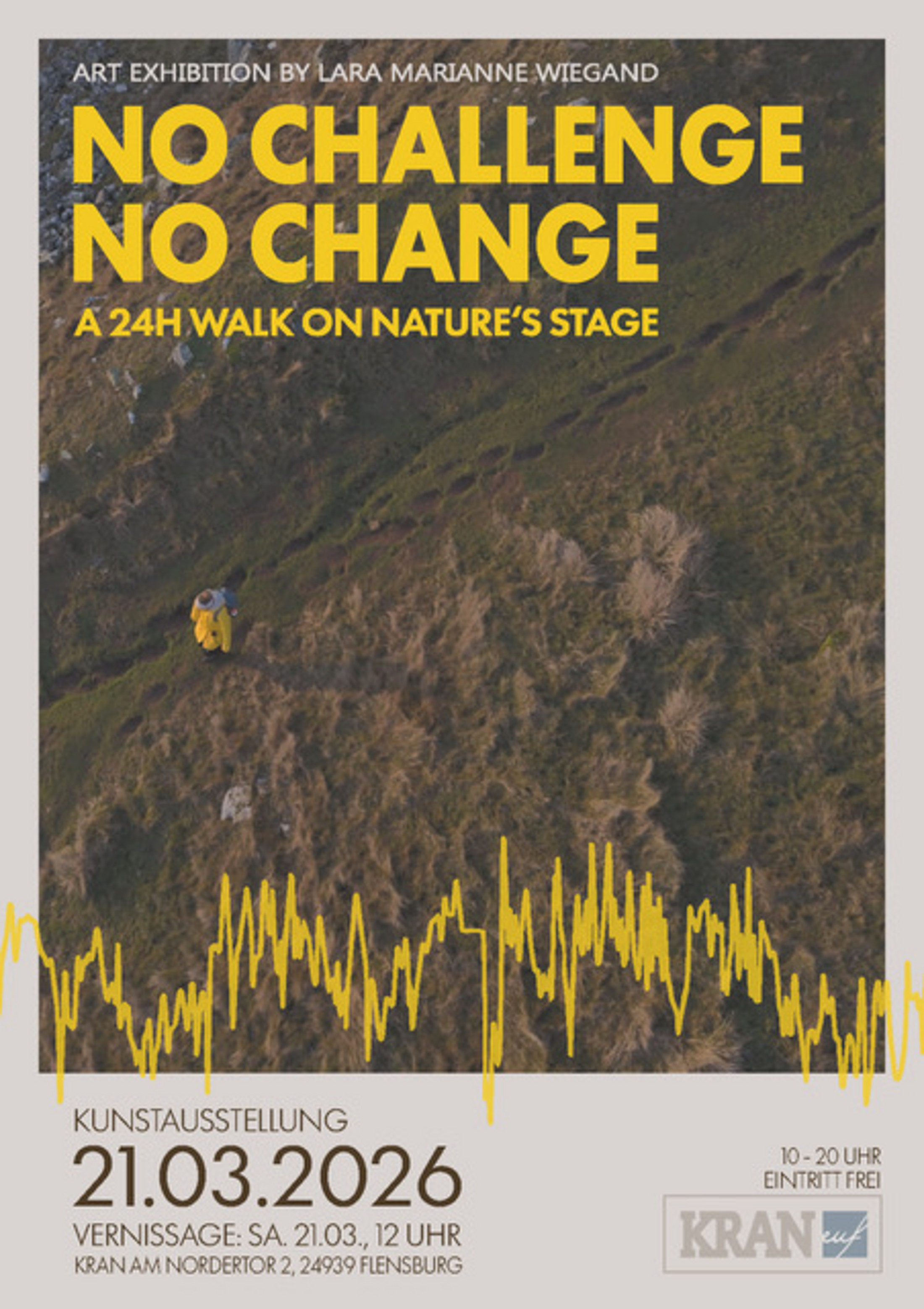 Ihre Eindrücke, Gefühle, Kämpfe, Fundstücke etc. von der Wanderung präsentiert sie unter dem Titel „No Challenge – No Change“ im KRAN.