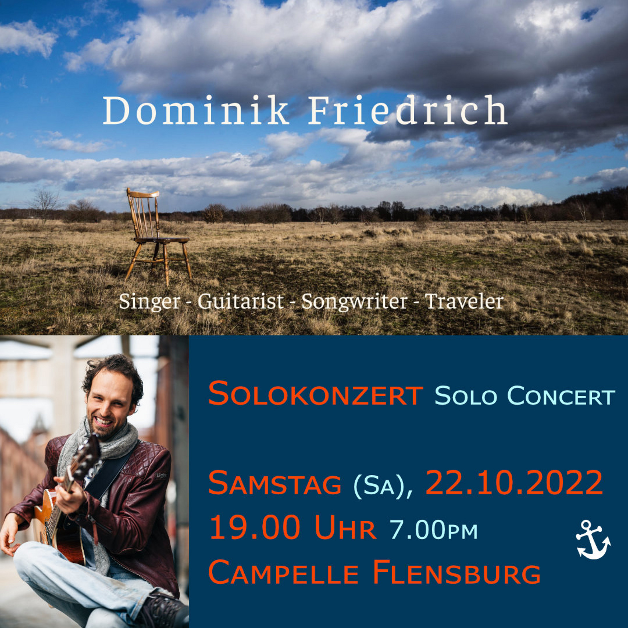Am Samstag, 22.10. macht der Berliner Singer und Songwriter Dominik Friedrich (www.dominik-friedrich.com, @dominik_friedrich_music) Station auf dem Flensburger Campus. Nur mit seiner Gitarre und seiner Stimme wird er den besonderen Raum der Campelle mit seinen Liedern füllen. Er bezeichnet sich als Gitarrenvirtuose und Kulturbotschafter und singt in acht verschiedenen Sprachen - und auch seine Texte erzählen vom Reisen, vom in der Fremde zu Hause sein. Es wird ein abwechslungsreicher und bewegender Abend.