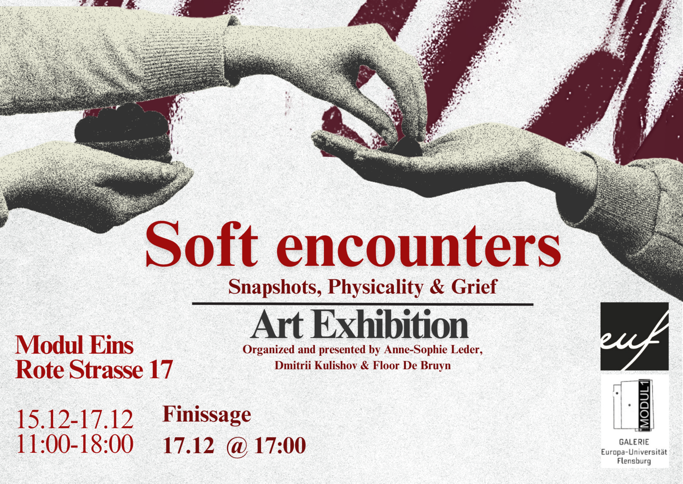 In der Ausstellung „Soft Encounters“ präsentieren Studierende des Studiengangs European Cultures and Society (EUCS) der Europa-Universität Flensburg Arbeiten, die im Rahmen des Autonomous Project entstanden sind. Die gezeigten Werke umfassen unterschiedliche Medien: Video und Animation, Keramik, Kohlezeichnungen und Ölmalerei. „Soft Encounters“ nähert sich der Fragilität und Vielschichtigkeit menschlicher Begegnungen. Die Arbeiten untersuchen die menschliche Condition und die flüchtige Subjektivität von Momenten des Aufeinandertreffens und des Abschieds – von körperlicher Bewegung über flüchtige Liebe und tiefe Emotionen bis hin zum scheinbar Nebensächlichen des Alltags. In diesen weichen, manchmal kaum wahrnehmbaren Berührungspunkten entstehen Geschichten, Spannungen und Zwischenräume, die die Besucher*innen einladen, ihre eigenen Erfahrungen von Nähe, Distanz und Vergänglichkeit zu reflektieren.