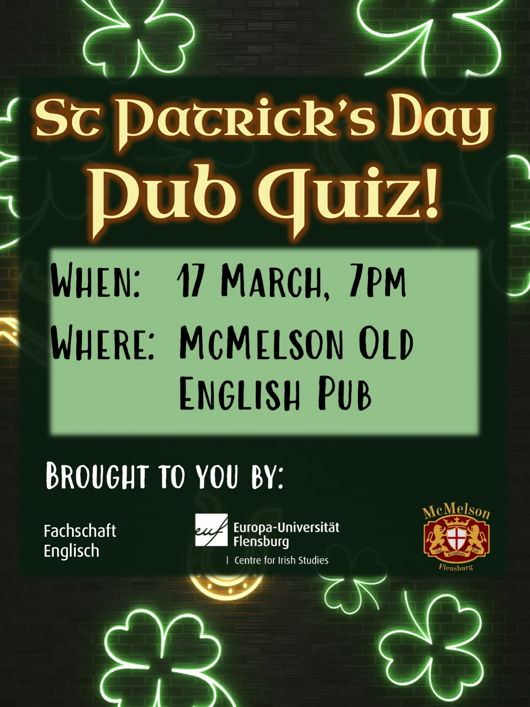 This year, to celebrate St Patrick’s Day, the EUF Centre for Irish Studies has teamed up with the FSV-Englisch and McMelson Old English Pub to host a St Patrick’s Day Pub Quiz!! Entrance is free (we only ask that you purchase a drink or two from the pub), and there will of course be prizes for 1st, 2nd, and 3rd place!