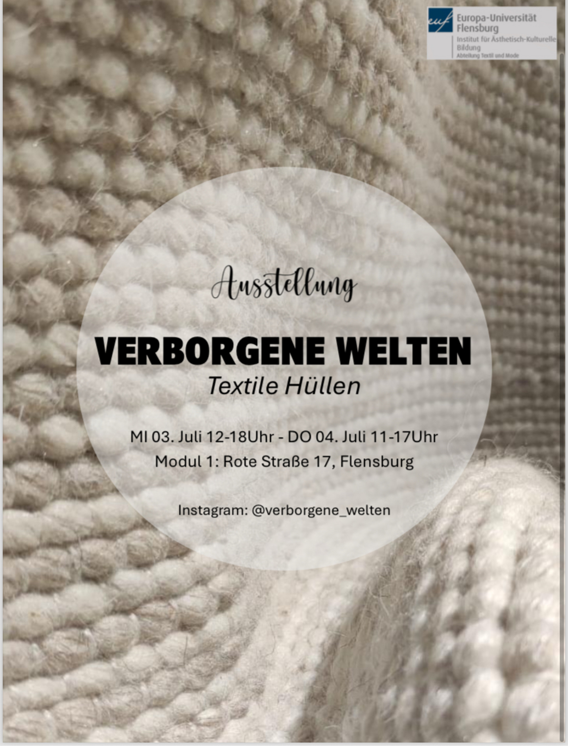 Die Ausstellung "Verborgene Welten - Textile Hüllen" ist das Ergebnis eines intensiven zweisemestrigen Projekts einer Gruppe der Textil und Mode-Studierenden des 4. Semesters. In dieser Zeit haben wurde sich umfassend mit dem Thema Hüllen auseinandergesetzt und die vielfältigen Möglichkeiten und Bedeutungen textiler Hüllen erforscht. Die Ausstellung bietet einen Einblick in die Arbeiten und Ergebnisse, welche die Vielschichtigkeit und Bedeutung von Hüllen in verschiedenen Kontexten beleuchten.