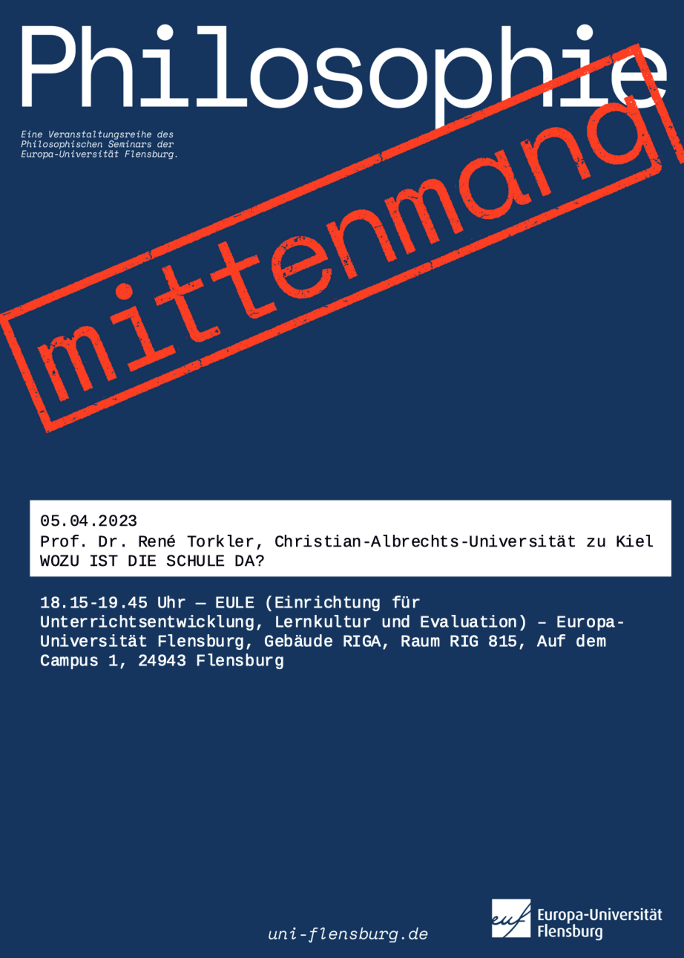 Prof. Dr. René Torkler (Christian-Albrechts-Universität zu Kiel) hält den ersten Vortrag im Frühjahrssemester in der Vorlesungsreihe Philosophie mittenmang, mit dem Titel "Wozu ist Schule da?"