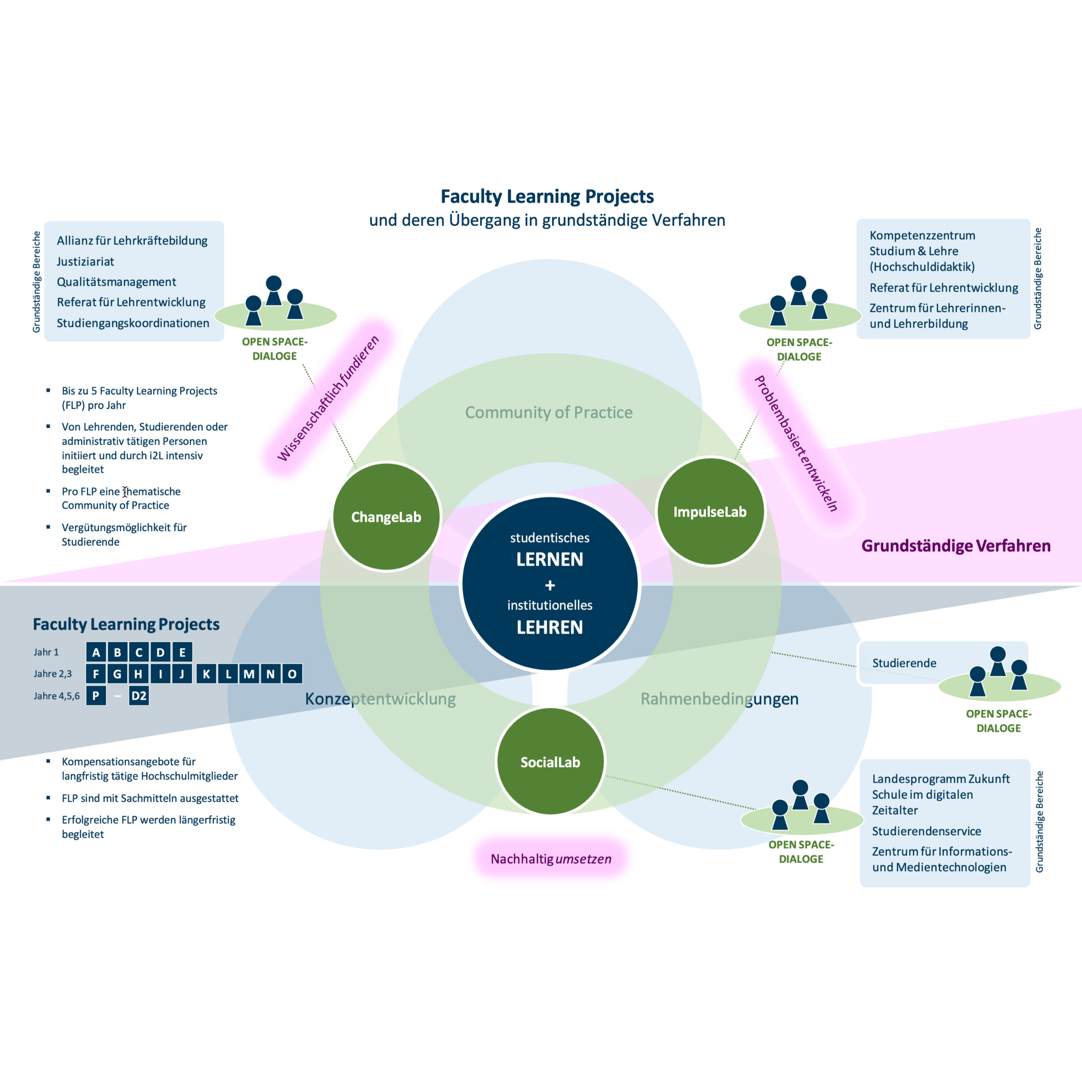 Angelehnt an die Methode der Faculty Learning Communities wird Team des i2L Faculty Learning Projekte (FLP) moderieren und unterstützen. FLP sind feste Arbeitsgruppen, die interdisziplinär und statusübergreifend zusammengesetzt sind. In jeweils einjährigen strukturierten Projekten bieten sie einen agiler Experimentierraum für spezifische Herausforderungen in Studium und Lehre, entwickeln und erproben innovative Lösungen. Das i2L stellt den FLP methodisch-didaktisch und technisch geschultes Personal zur Seite und fungiert als Schnittstelle zu den universitären Einheiten, die Innovationsprozesse gezielt unterstützen bzw. bewerkstelligen können. Dies gewährleistet, dass die Innovationen nicht zu einem späteren Zeitpunkt an rechtlichen oder technischen Rahmenbedingungen scheitern. Für das erste Jahr 2026 sind folgende FLP geplant: