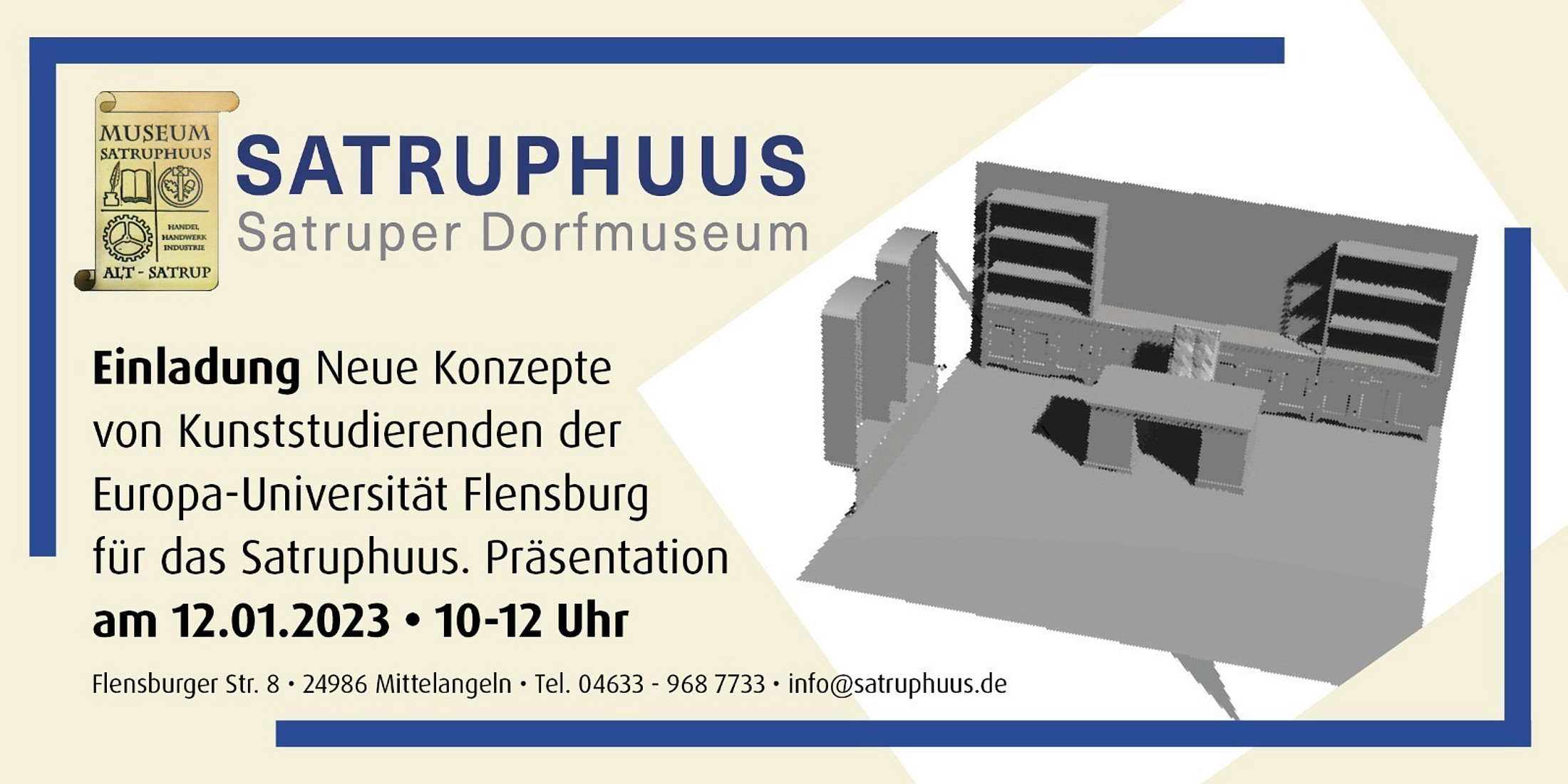 Studierende des Seminars Ästhetische Szenografien stellen neue Konzepte für das Dorfmuseum Satruphuus vor. Das Projekt begann bereits im vorigen Semester und ist eine Kooperation im Außerschulischen Lernort mit Unterstützung des Ministeriums für Allgemeine und Berufliche Bildung, Wissenschaft, Forschung und Kultur, Kulturelle Bildung.