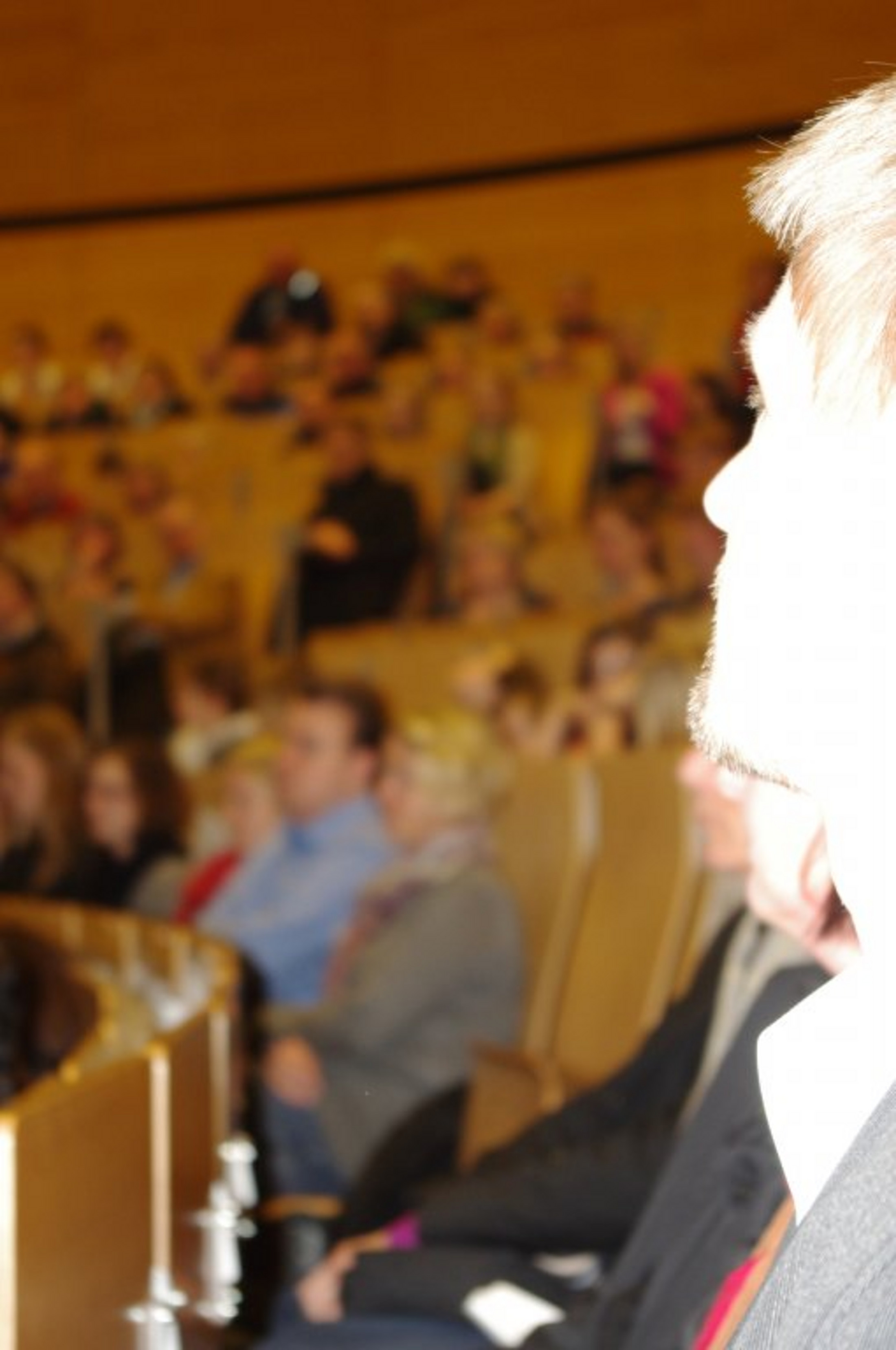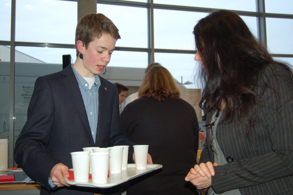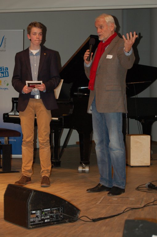 Um 17:30 ging es  los. Hausherr Manfred Blohm vom Institut für Ästhetisch-Kulturelle Bildung begrüßte die Gäste, die Schleswiger Filmproduktionsplanerin Kirsten Schultz stellte das Projekt vor und dann übernahmen die beiden Schüler Benedikt T. Brahm und Kim Leon Schön Amsgruber die Moderation. Souverän baten sie den ersten Ehrengast, Schirmherren und Stadtpräsidenten Christian Dewanger, auf die Bühne. Der verriet, dass er jetzt schon neugierig auf die Perspektive der Schüler von Flensburg auf die Stadt sei.