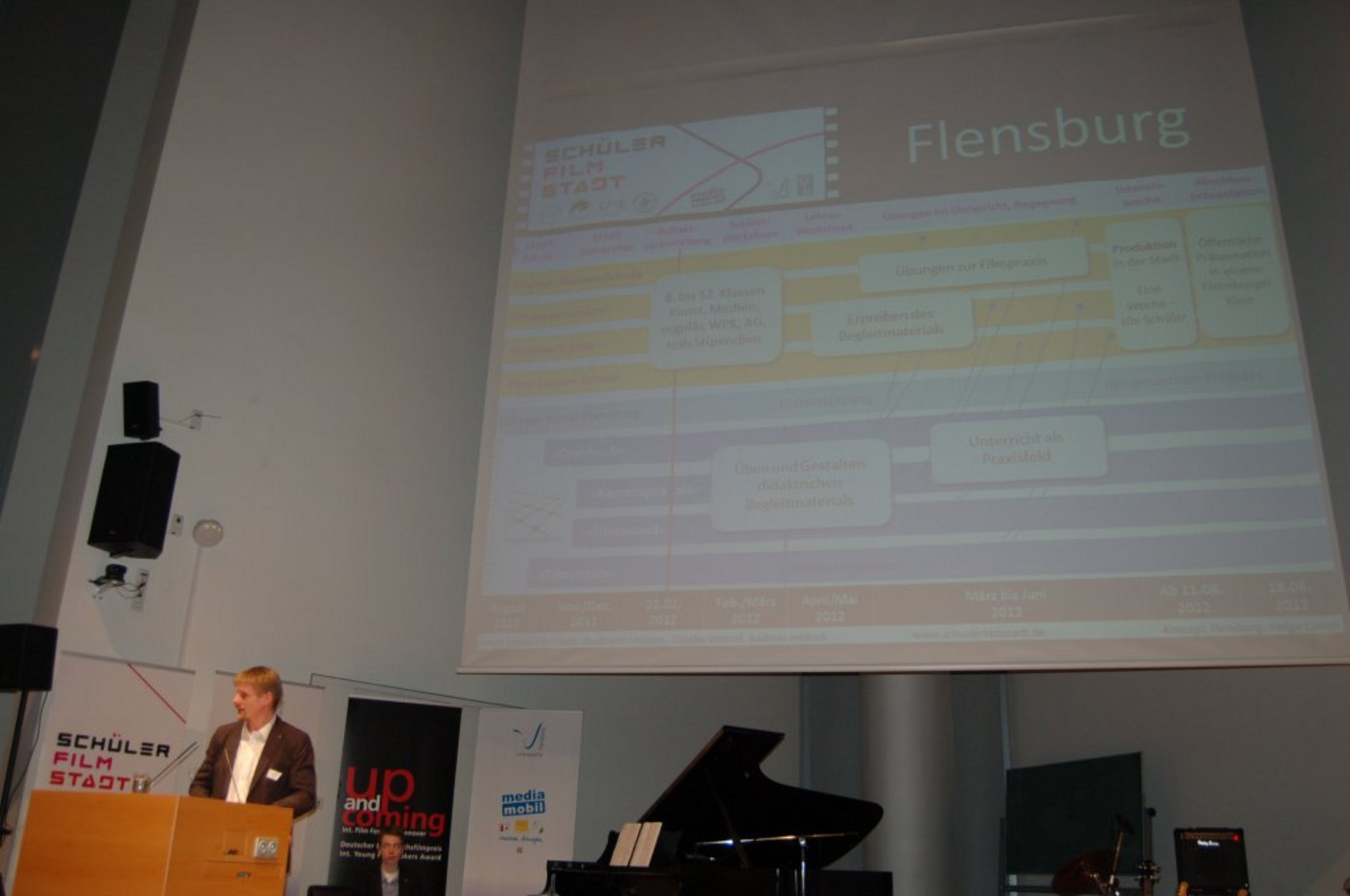 Die Flensburger Bewerbung sei etwas Besonderes gewesen, verriet Claudia Wenzel, die gemeinsam mit Burkhard Inhülsen das Projekt "Schülerfilmstadt" entwickelt hat. Warum? Weil sich in Flensburg vier Schulen gemeinsam mit der Hochschule beworben hätten. Dieses Konzept einer vorbildlichen regionalen Vernetzung von Wissen und Erfahrung hätte sie überzeugt. Und so hat Flensburg es geschafft, zur nördlichsten "Schülerfilmstadt" zu werden – Dreißig Städte hatten sich beworben, fünf wurden genommen: Aachen, Gera, Flensburg, Stralsund und Würzburg sind die SchülerFilmStädte 2011 bis 2013.