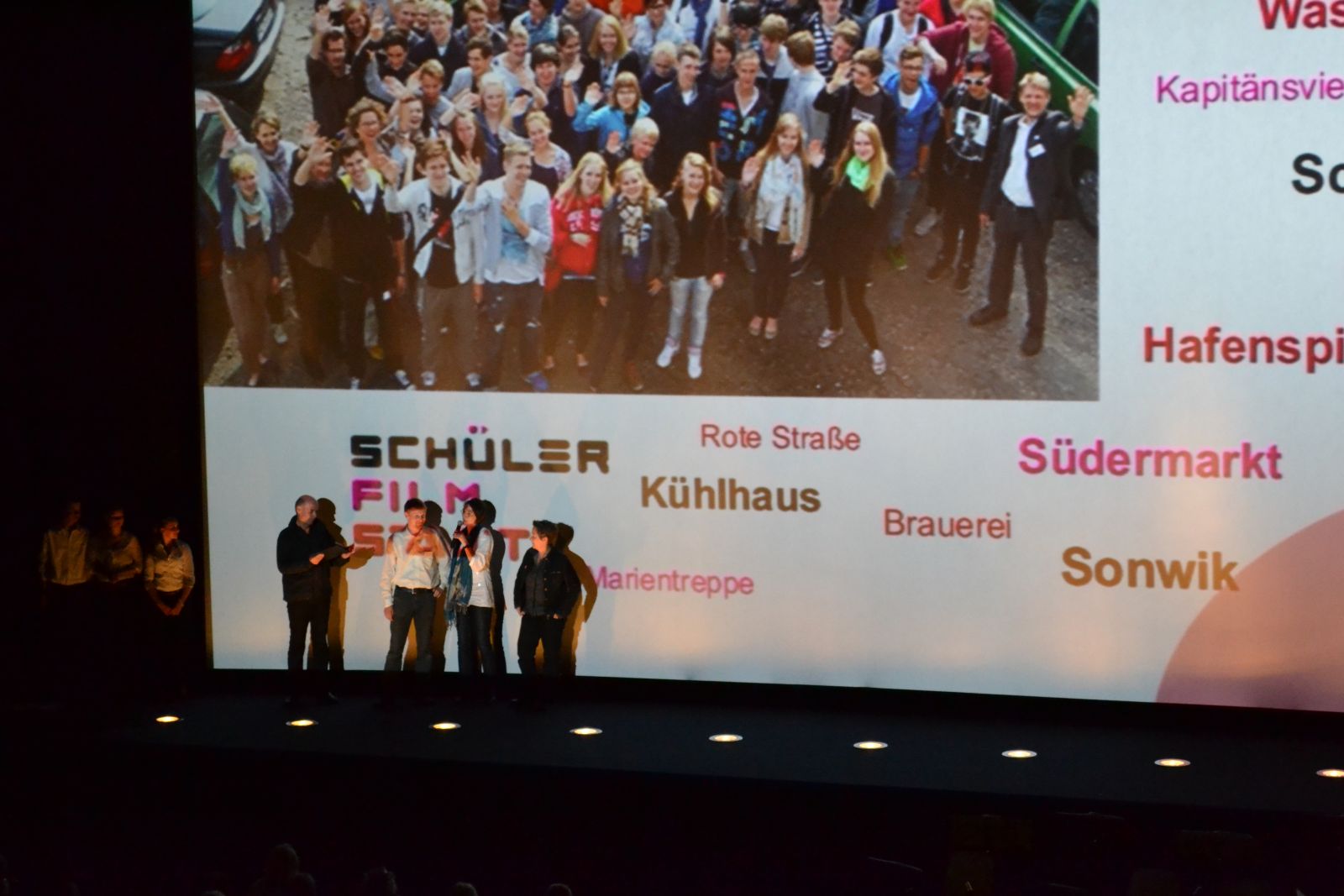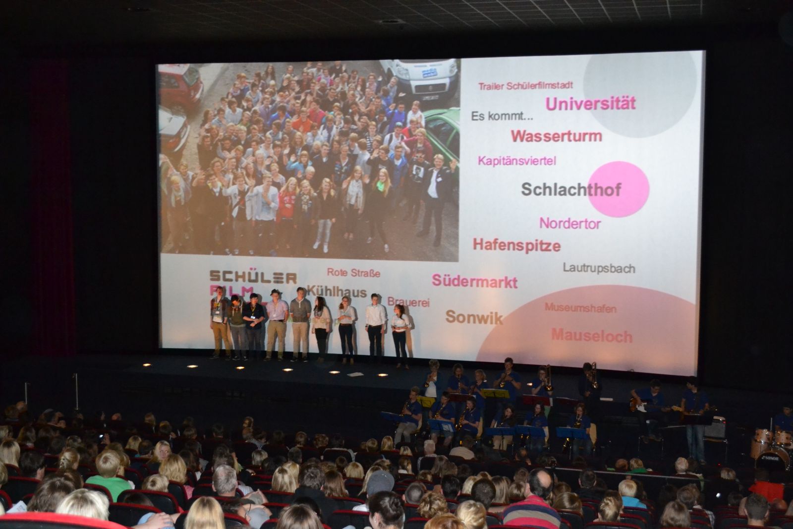 Am 18.06.2012 war es soweit: Die 15 Schülerfilme wurden im fast bis auf den letzten Platz gefüllten großen Saal der UCI-Kinowelt Flensburg gezeigt. Moderiert von Schülerinnen und einem Schüler, die selbst im Projekt dabei waren und begleitet von der Big-Band der Goethe-Schule verbrachten wir einen kurzweiligen Abend im Kinosaal. Jeder Film zeichnet sich durch seinen ganz eigenen Charakter aus, trägt die »Handschrift« des Filmteams. Alle Schülerteams haben es geschafft, ihre Ideen zu Geschichten zu machen und diese filmisch umzusetzen – ein voller Erfolg!