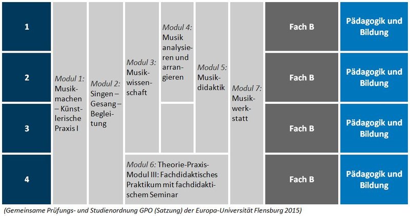 Der Teilstudiengang Musik muss mit dem Teilstudiengang Pädagogik und Bildung sowie einem weiteren Teilstudiengang des B.A. Bildungswissenschaften (Fach B) kombiniert werden.