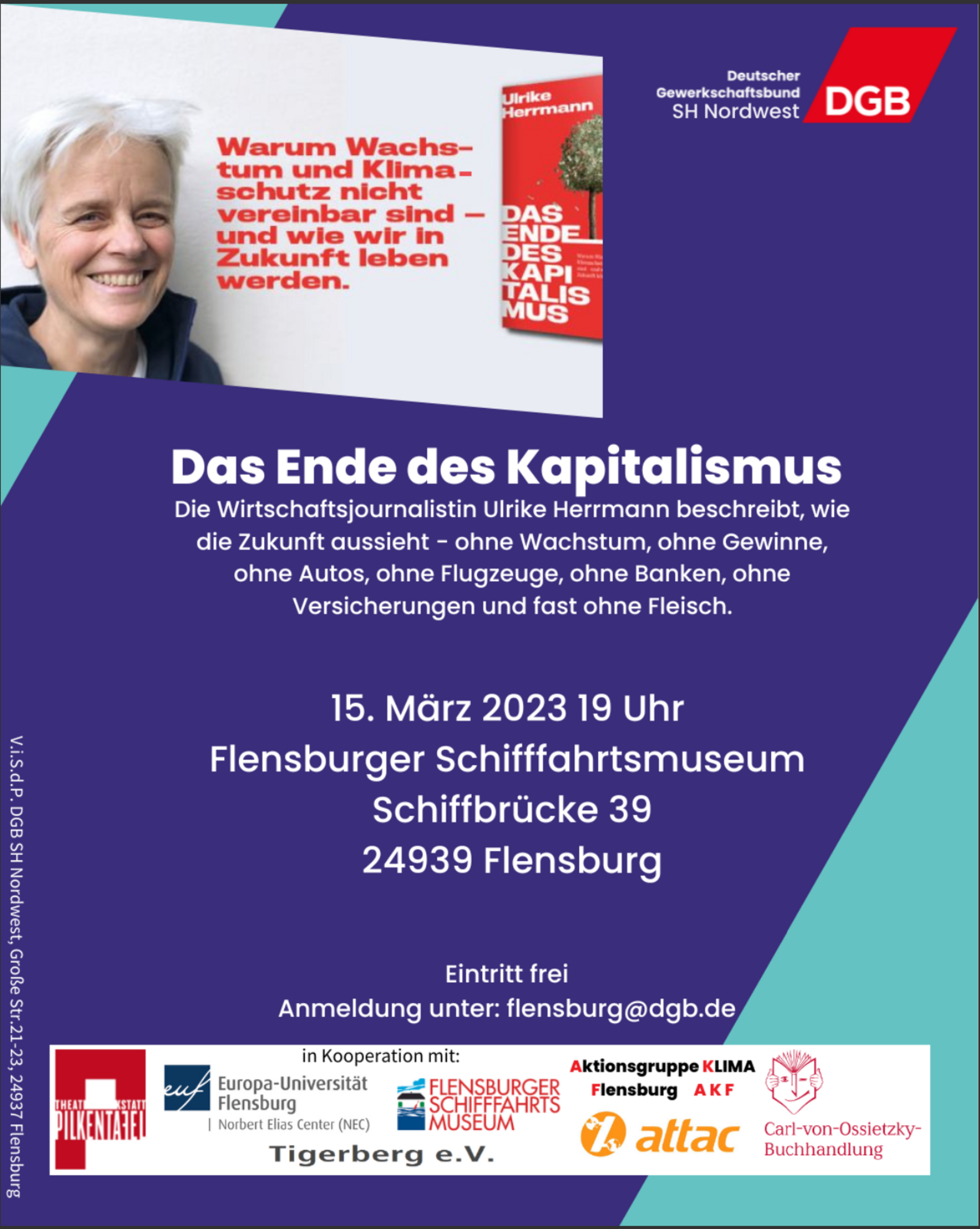 Die Lesung wird organisiert vom DGB SH Nordwest in Kooperation mit dem Norbert Elias Center (NEC), der Theaterwerkstatt Pilkentafel, dem Flensburger Schifffahrtsmuseum, dem Tigerberg e.V., der Aktionsgruppe Klima Flensburg, attak und der Carl-von-Ossietzky-Buchhandlung.