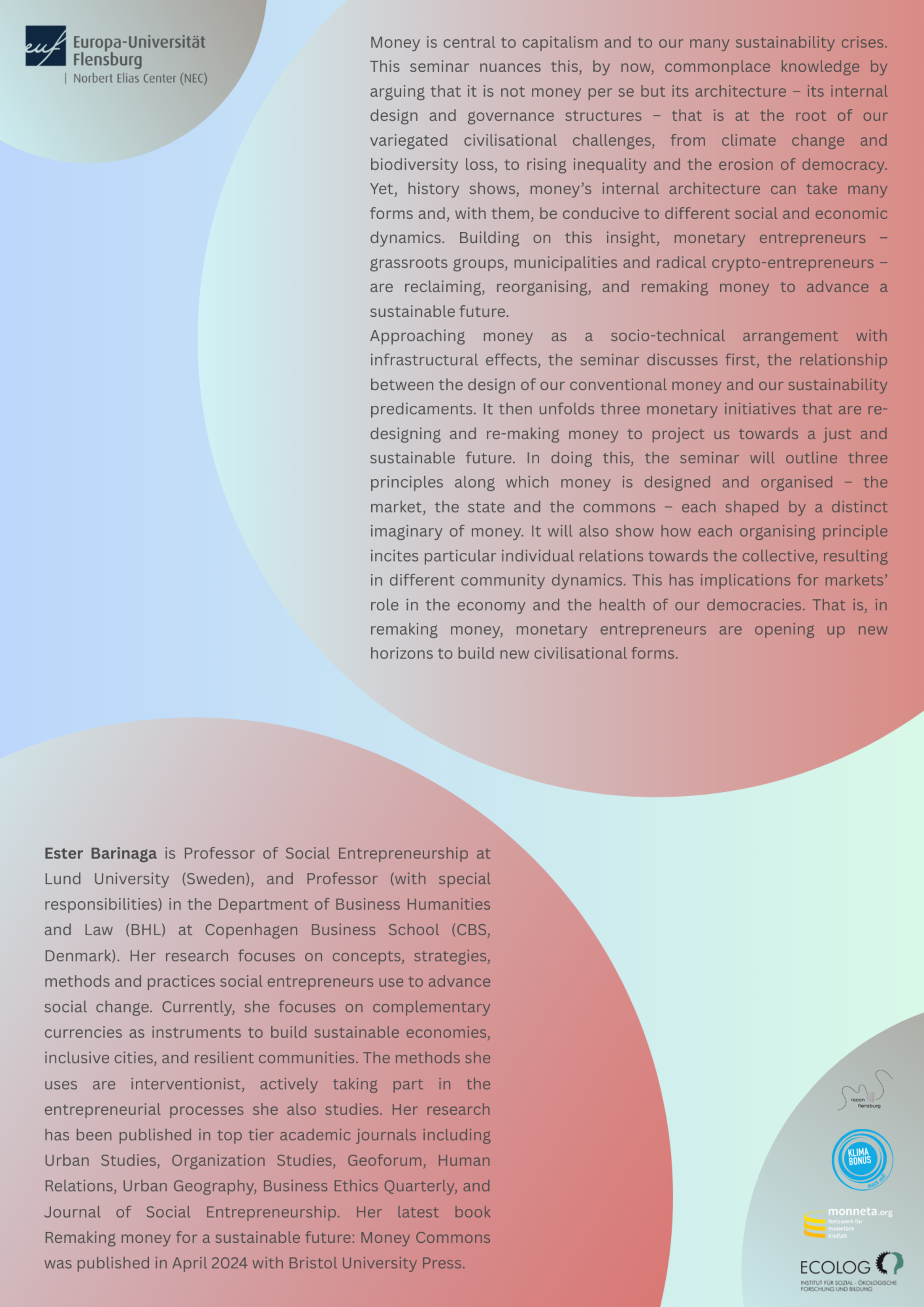 Money is central to capitalism and to our many sustainability crises. This seminar nuances this, by now, commonplace knowledge by arguing that it is not money per se but its architecture – its internal design and governance structures – that is at the root of our variegated civilisational challenges, from climate change and biodiversity loss, to rising inequality and the erosion of democracy. Yet, history shows, money’s internal architecture can take many forms and, with them, be conducive to different social and economic dynamics. Building on this insight, monetary entrepreneurs – grassroots groups, municipalities and radical crypto-entrepreneurs – are reclaiming, reorganising, and remaking money to advance a sustainable future.