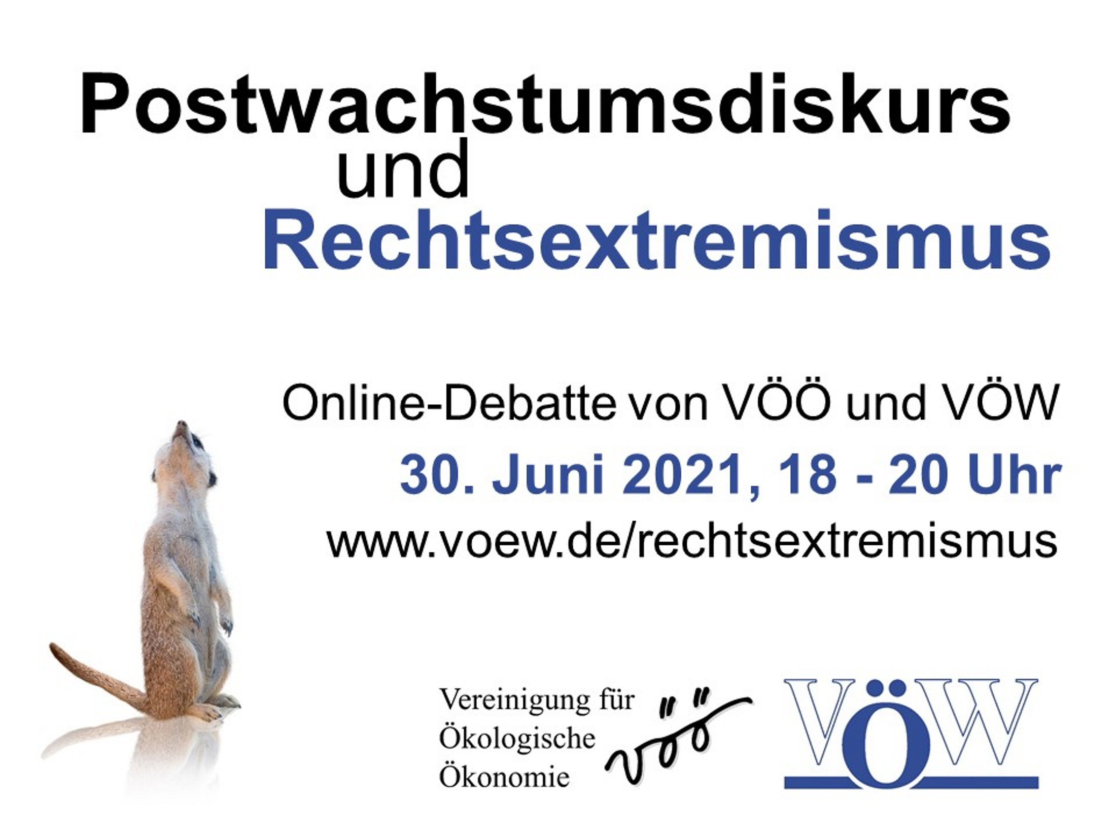 Die Vereinigung für Ökologische Ökonomie (VÖÖ) und die Vereinigung für ökologische Wirtschaftsforschung (VÖW) laden sehr herzlich ein, diese Fragen mit drei Impulsgeber*innen und den Teilnehmenden bei einer Online-Debatte "Postwachstumsdiskurs und Rechtsextremismus" zu diskutieren.