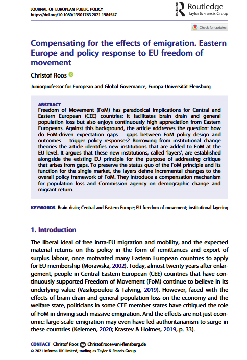 Prof. Dr. Christof Roos hat kürzlich einen neuen Artikel mit dem Titel "Compensating for the effects of emigration. Eastern Europe and policy response to EU freedom of movement" im Journal of European Public Policy veröffentlicht. In dem Artikel hebt Christof Roos die paradoxen Auswirkungen der Freizügigkeitsregelung auf die mittel- und osteuropäischen Länder hervor, wie z.B. die hohe allgemeine Wertschätzung trotz des massiven Bevölkerungsverlustes, und geht auf die Frage ein, wie die Erwartungslücke zwischen der Ausgestaltung der Freizügigkeitspolitik und ihren Ergebnissen politische bewältigt wird. Er argumentiert, dass auf EU-Ebene neue "institutional layers" zum Freizügigkeitsregime hinzugefügt werden, um die negative Effekte zu kompensieren, ohne jedoch den Status quo und die Funktion des Binnenmarktes zu verletzen.