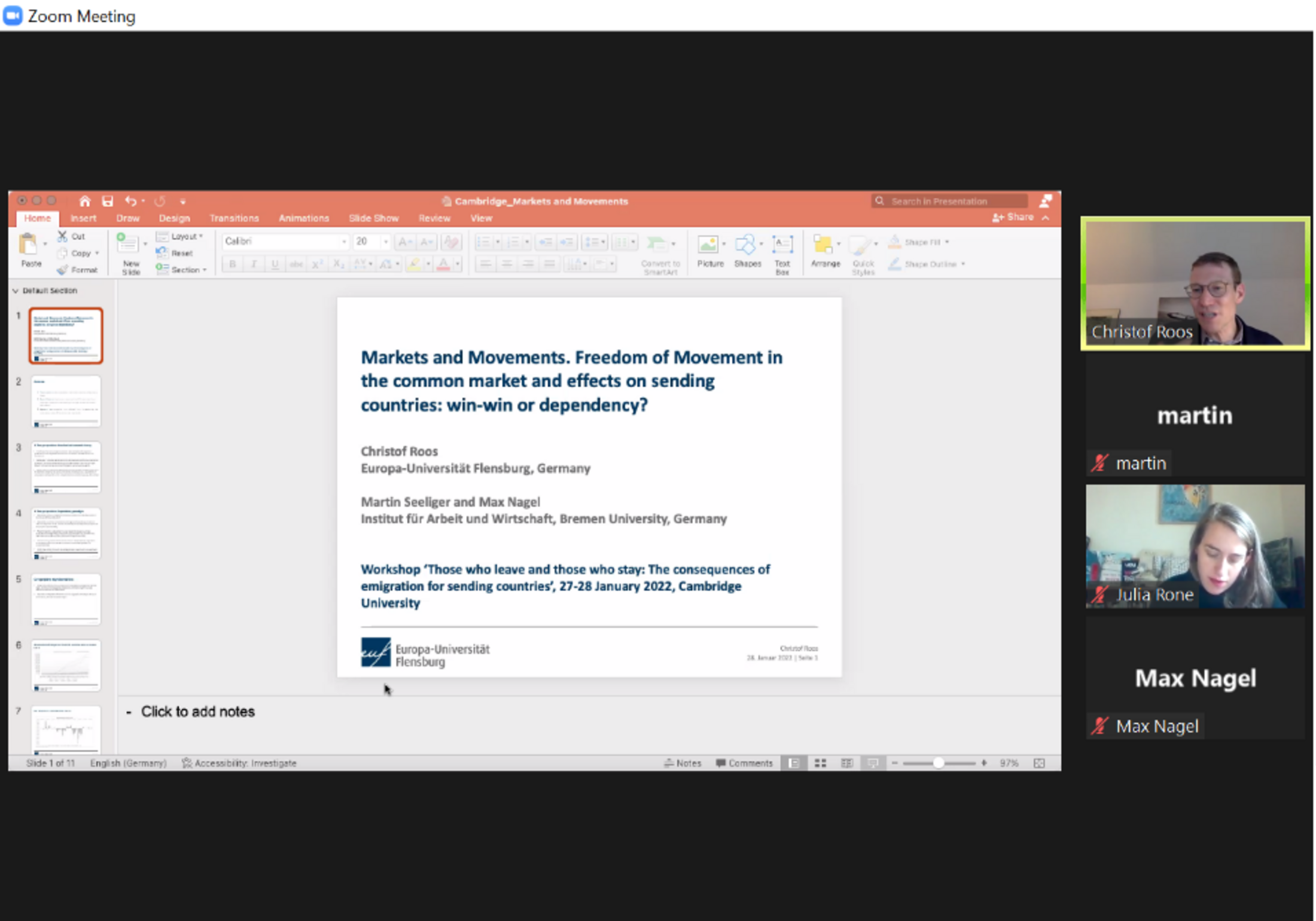 Am 28. Januar 2022 nahmen Prof. Dr. Christof Roos, Dr. Martin Seeliger und Dr. Max Nagel an der Online-Konferenz "Those who leave and those who stay: the consequences of emigration for sending countries" teil, die vom Centre for Research in the Arts, Social Sciences and Humanities of the University of Cambridge (CRASSH) organisiert wurde. Die Projektmitglieder präsentierten ihr Papier mit dem Titel "Markets and Movements. Freedom of Movement in the common market and effects on sending countries: win-win or dependency?". In dem Papier stellen sie die Annahme der neoklassischen Wirtschaftstheorie in Frage, dass die Freizügigkeit von Personen innerhalb der EU zu einer "Win-Win-Situation" für alle beteiligten Länder und ihre Binnenmärkte führt. Stattdessen argumentieren sie in Anlehnung an die Dependenztheorie, dass die massive Auswanderung aus einigen EU-Mitgliedstaaten, insbesondere aus dem Süden und Osten, deren Status als periphere Länder und ihre Abhängigkeit von den Kernländern der EU noch verschlimmert. Abschließend bieten sie einige potenzielle Lösungen für diese eher pessimistischen Aussichten an, wie z. B. Gewerkschaftsbildung, eine kohärentere Investition von EU-Mitteln und die Förderung von Forschung und Innovation.