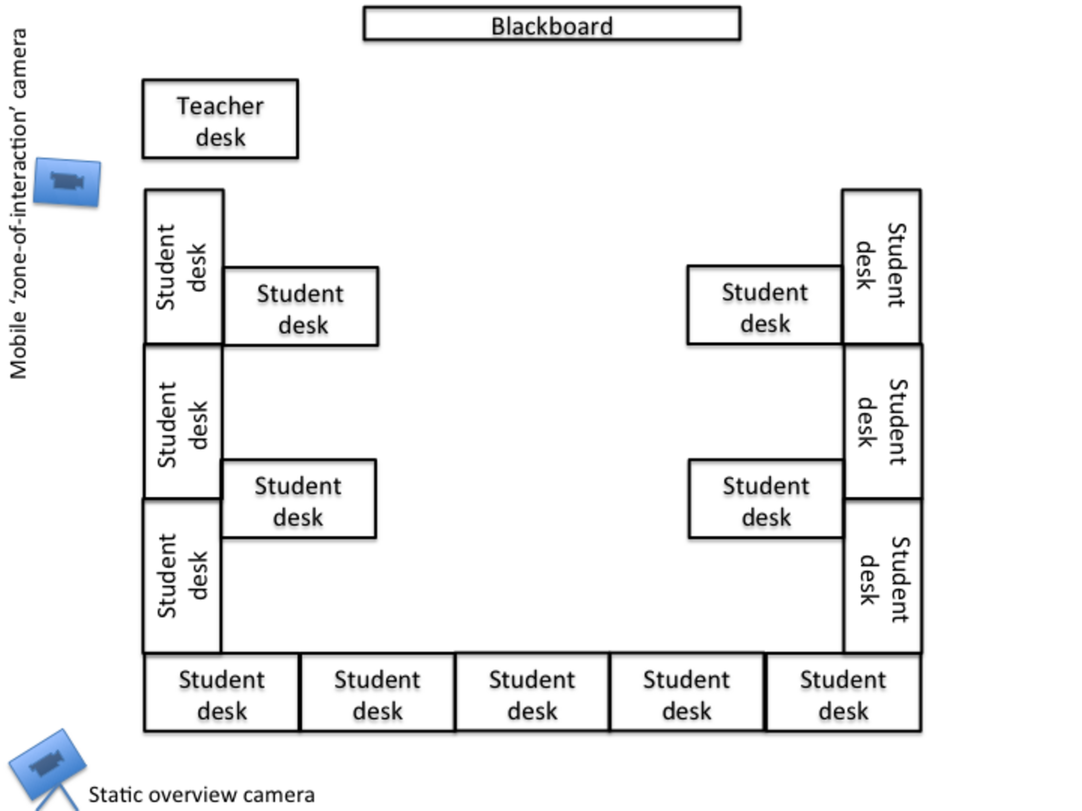 Capturing classroom discourse in a comprehensive way meant having to record entire lessons from beginning to end. The recordings were made with two cameras, one in the front and the other in the back of the classroom (cf. Figure 1). The front camera was a mobile device which focused on the interaction between teacher and pupil(s), while the back camera was set on a tripod in the corner to capture an overview of the classroom. One person was present during the lesson to operate both cameras. An additional external microphone attached to the overview camera was used to record a large part of the talk. Figure 1 shows how the two cameras were positioned in the classroom. The seating plan is just one example of how pupils can sit in a primary school classroom: