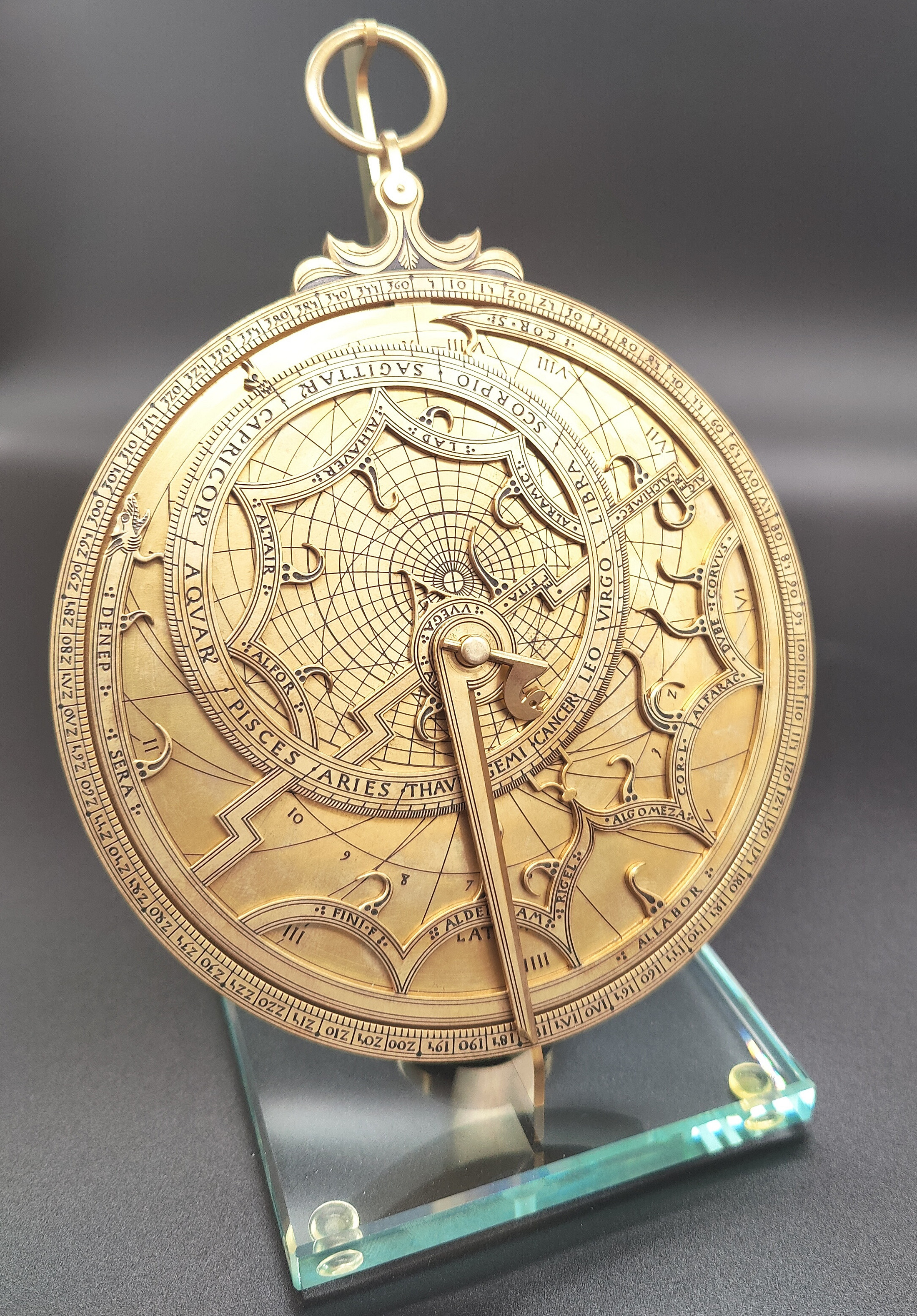 Astrolabien sind astronomische Instrumente, die für verschiedene Zwecke wie Zeitmessung, Himmelsnavigation, Astrologie und terrestrische Vermessung verwendet wurden. Unser ebenes Astrolabium ist die Nachbildung eines Instruments, das in der Intarsie des Studiolo des Erzherzogs Federico in Urbino abgebildet ist. Das Originalinstrument befand sich im Musée Anne de Beaujeu und wurde 1977 gestohlen. Die Rekonstruktion wurde von Martin Brunold angefertigt, der seit etwa 1995 als professioneller Astrolabienmacher arbeitet. Das Herstellungsdatum (2004) und das Zeichen des Herstellers (MB) sind zusammen mit der Seriennummer "16" auf der Rückseite der Mater zu sehen, nachdem die Alidade entfernt und das Instrument in seine Einzelteile zerlegt wurde. Unser Astrolabium ist aus Messing gefertigt und hat einen Durchmesser von 13 cm und ein Gewicht von 625 Gramm.