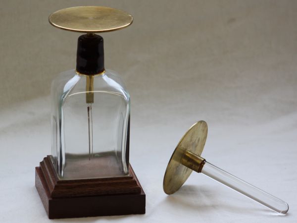 Das Kondensatorelektroskop wurde zuerst von Alesandro Volta 1787 beschrieben. Zwei lange Strohhalme sind über einen Metallfaden freischwingend aufgehängt und leitend mit einer Kondensatorplatte verbunden. Die ganze Kosntruktion befindet sich in einem Glas um unerwünscht Luftbewegungen zu verhindern. Ist die Platte nicht geladen wirkt auf die Halme nur die Gravitationskraft - sie hängen gerade nach unten.