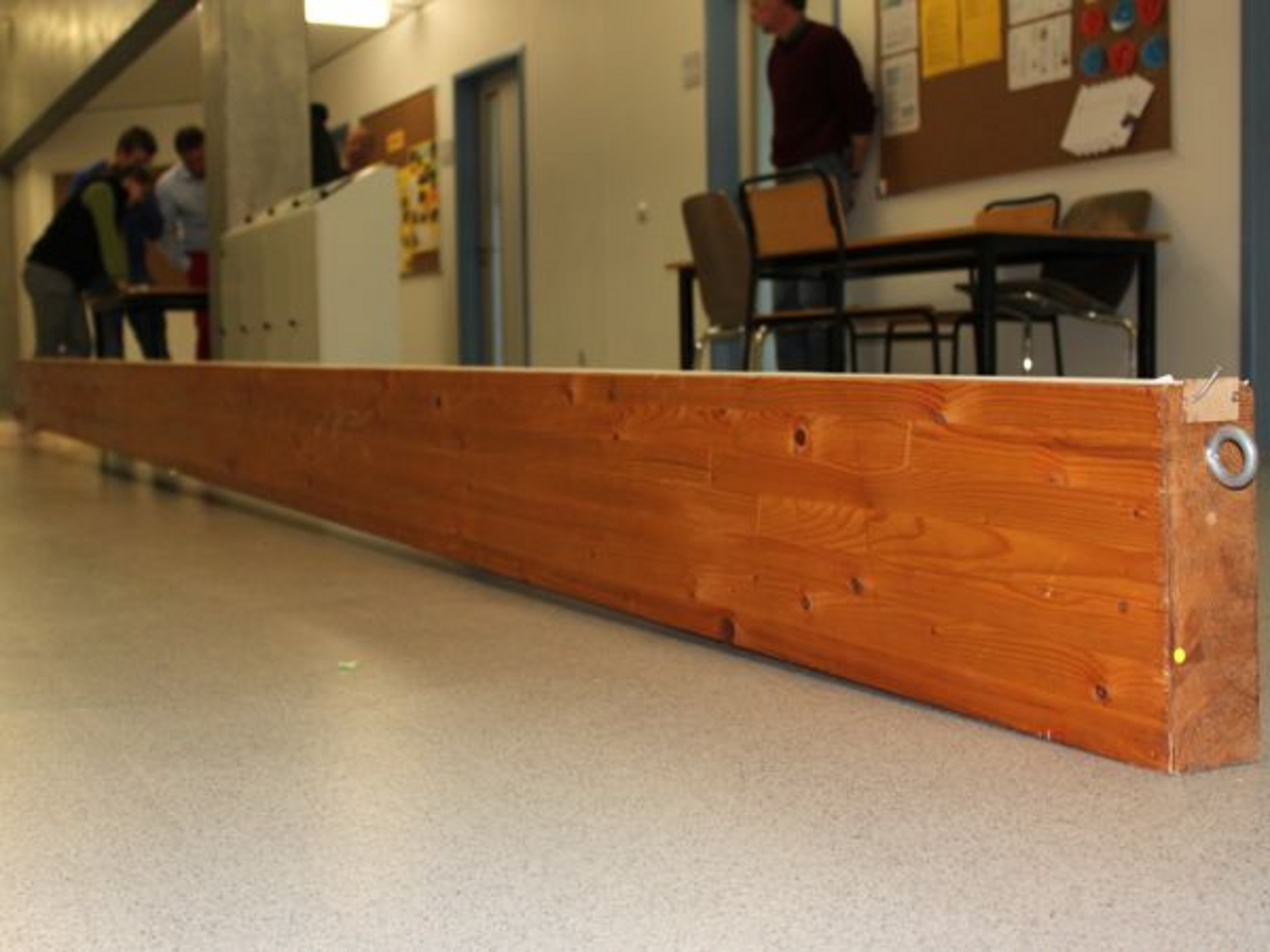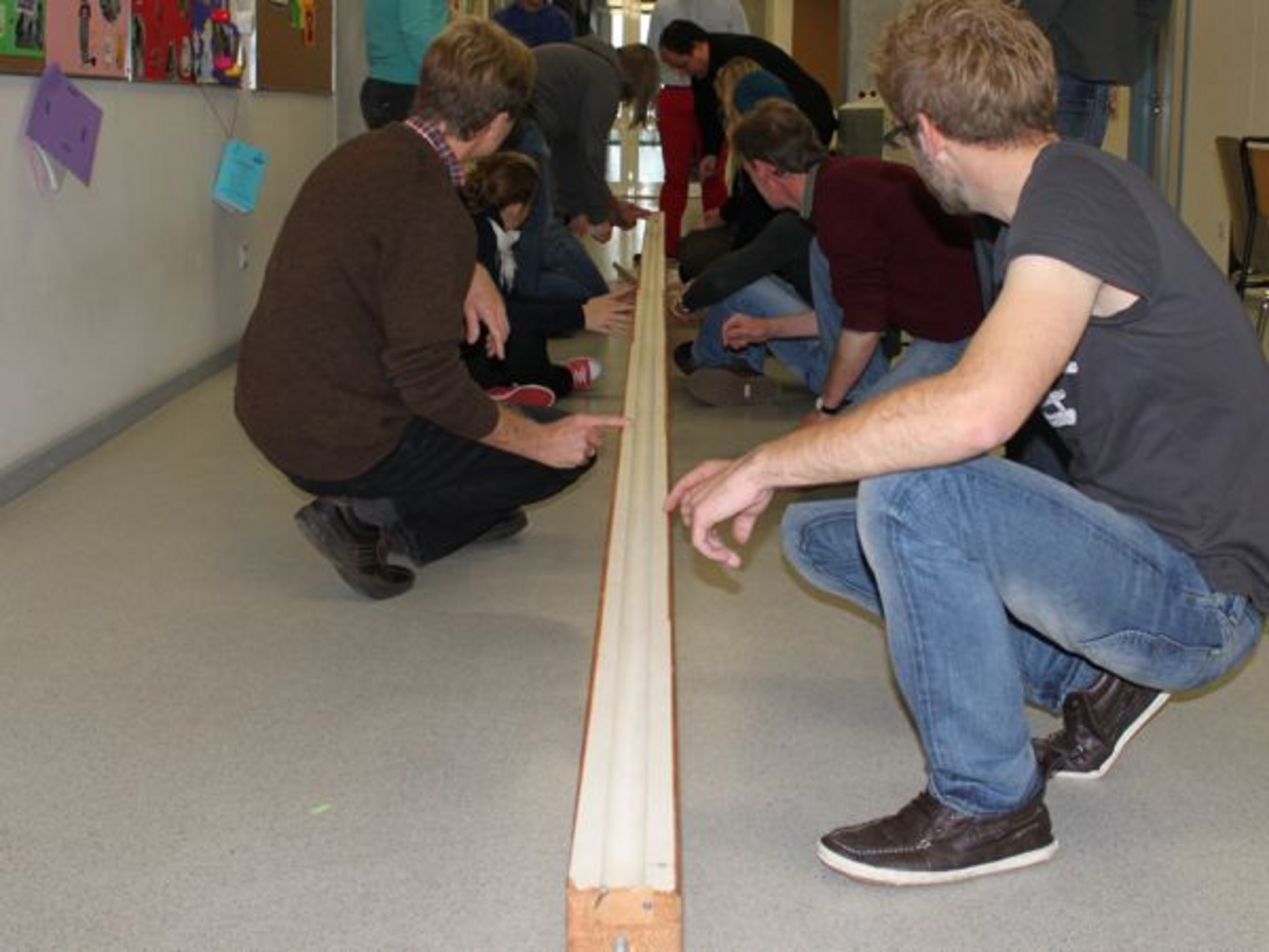 Die Fallrinne nach Galilei ist ein 8m langer Holzbalken. In ihm ist eine halbkreisförmige Kerbe eingelassen, die zur Verringerung der Reibung mit Papier ausgeschlagen ist. In Galileis 'Discorsi' heißt es hier zu: