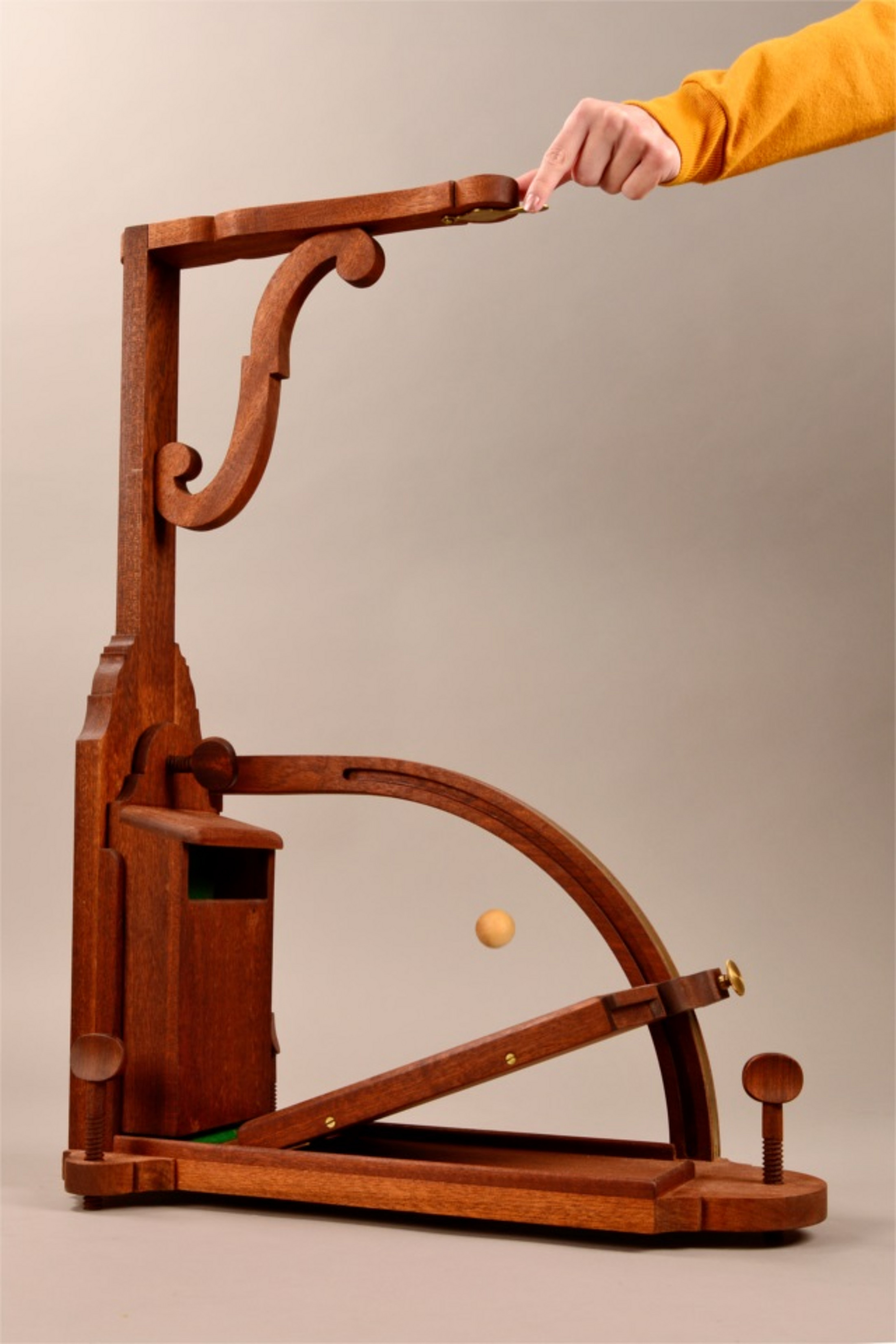 Zur Durchführung des Experimentes wird wie oben angedeutet, die Metallblende unter der Durchgangsöffnung im oberen Arm zur Seite geschwenkt und eine hölzerne Kugel oder Murmel prallt nach ihrem senkrechten Fall auf die fixierte Marmorplatte. Abhängig vom eingestellten Winkel wird die Kugel nun mechanisch reflektiert und trifft die Öffnung der Holzkiste, die sich in einer für den Winkel geeigneten Höhe befinden muss. Man kann idealisiert feststellen, dass beim Stoßprozess der Einfallswinkel zum Lot der Platte auch dem Ausgangswinkel entspricht. Diese Erkenntnis, die heute eher in der Optik bekannt ist, findet hier also ihre mechanische Entsprechung beim elastischen Stoß.