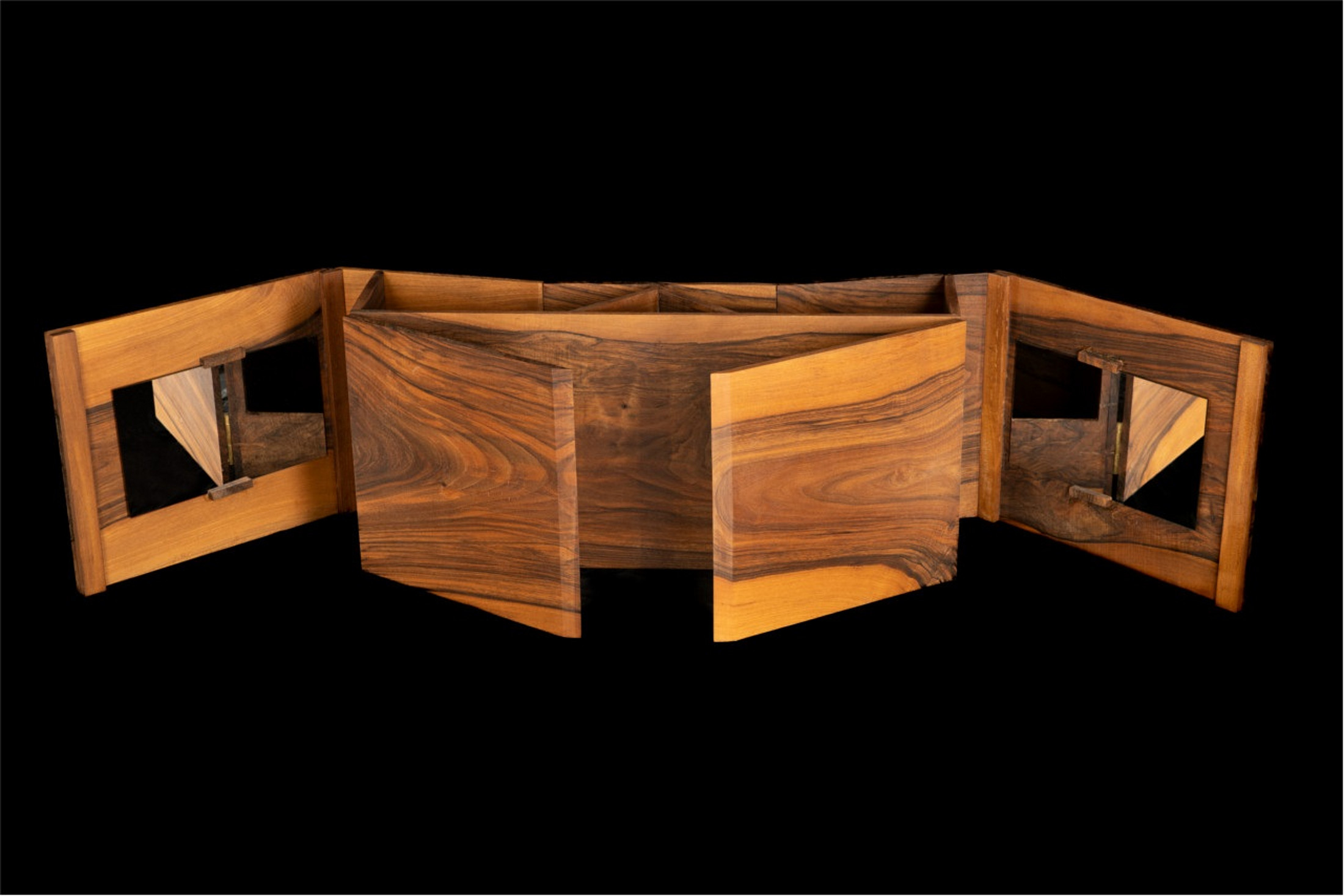 Die Bilder zeigen die Rekonstruktion unseres ehemaligen Masterstudierenden Sebastian Reder, der aus einer reinen Grundrisszeichnung diesen Apparat nachbauen konnte. Beim Nachvollzug der Ergebnisse kam er auf ähnlich kritische Ergebnisse wie Helmholtz selbst, er stieß jedoch auch auf möglicherweise physiologisch bedingte Abweichungen. Ähnlich wie in der zeitgenössischen Diskussion des 19. Jahrhunderts waren Helmholtz Aussagen punktuell nicht nachvollziehbar, an anderer Stelle nur erahnbar, was der Physiologe seinerzeit gemeint haben könnte. In diversen Messreihen auf mittlere und große Distanzen konnte allerdings auch eine für stereoskopische Betrachtungen wichtige Größe verifiziert werden: die Länge der Basislinie. Auch mit diesem simplen Instrument war ein räumliche Auflösung bis zu Distanzen von 3000 Metern gut erkennbar.