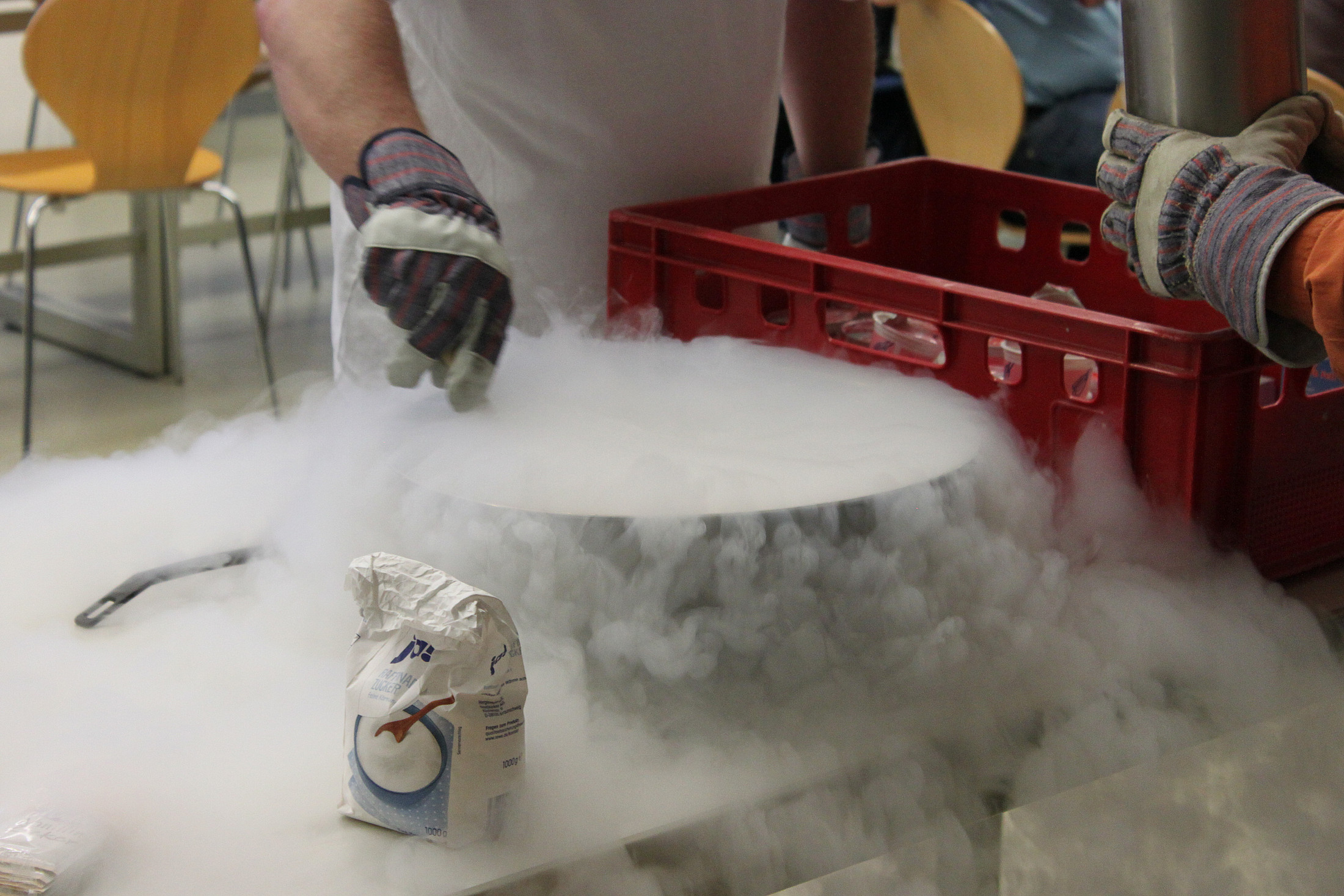 Als besonderes Highlight gab es frisch zubereitetes Erdbeereis, physikalisch korrekt hergestellt durch das Einrühren flüssiger Luft.